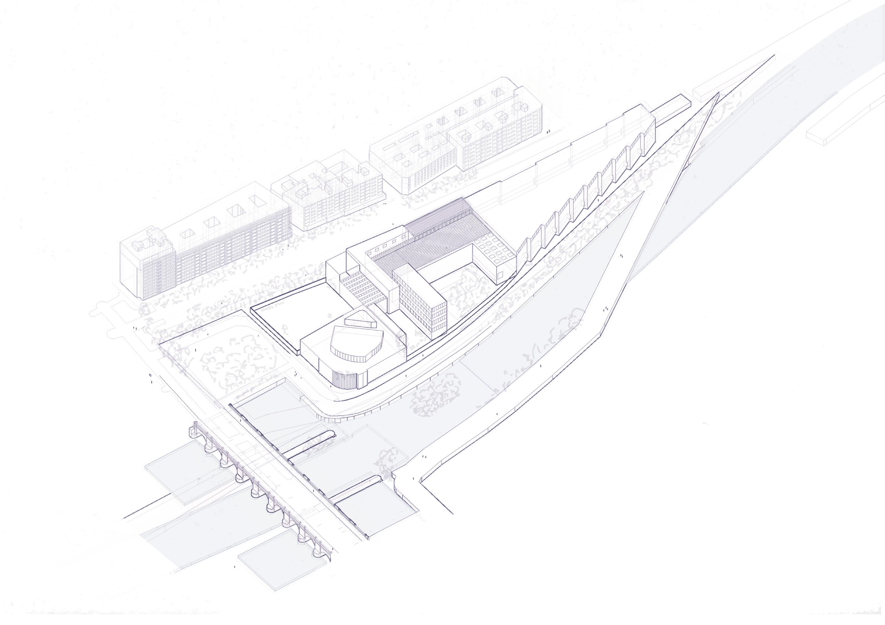 Se busca una doble direccionalidad del conjunto orientándose el proyecto no solo hacia el rio Manzanares, sino también hacia la gran apertura de la ciudad situada hacia el norte de la parcela. Se genera un foco del cual se abre el proyecto hacia el entorno más próximo, una pieza de contacto entre la trama urbana más sólida y la zona urbana de Madrid Rio.