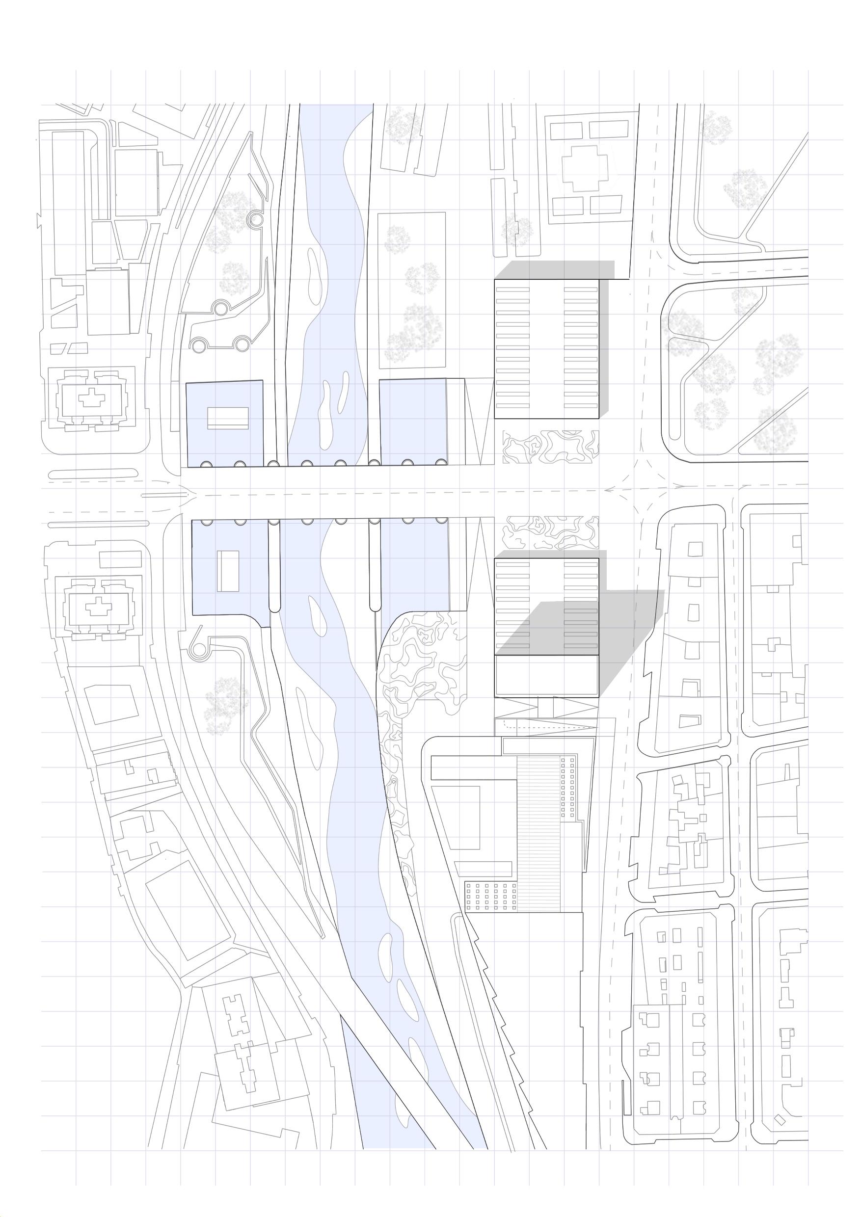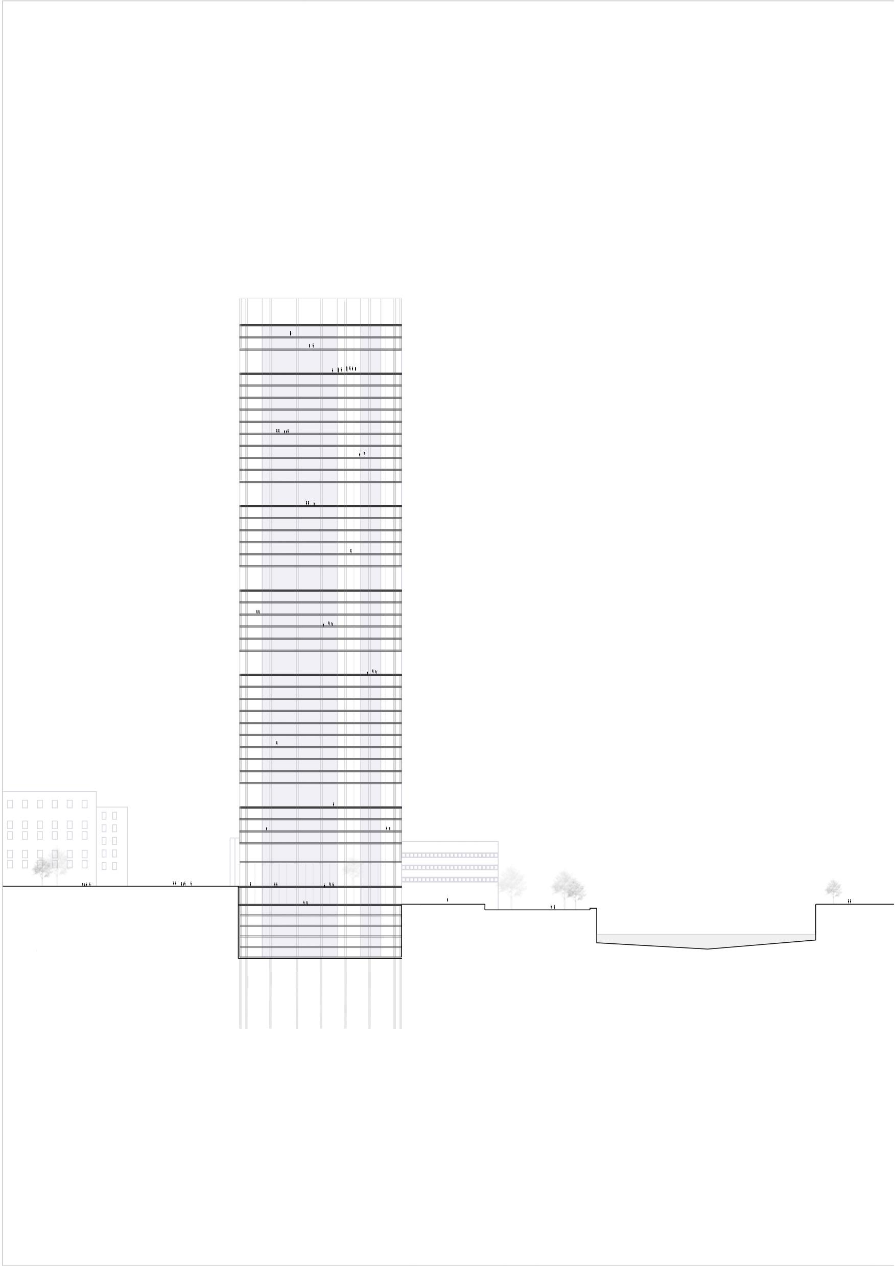 La presencia del rio Manzaqnares de una manera tan próxima al proyecto, deriva en entenderlo como una parte más de este. La principal consecuencia ocurre en el cambio de cota entre los distintos planos urbanos a tratar. En primer lugar encontramos un plano urbano superior formado por todo aquello situado en cota de la parte superior (transitable) del puente de Segovia; en dicha cota se sitúa la entrada principal tanto a la torre como al auditorio como dos volýumenes muy orizontales qie sobresalen dejando el recorrido del puente entre medias de estos. En segundo lugar encontramos la cota del paseo de Madrid Rio, que coincide con aquella cota más baja del puente de Segovia; siendo esta la cota de acceso directo a la zona deportiva y zona cultural (aunque también poseen acceso desde el inerior de los volúmenes mencionados anteriormente. La torre y su conjunto partiendo de estas dos franjas horizontales, crece hacia abajo levemente con un parking e imponentemente hacia arriba con 40 plantas sobre rasante.