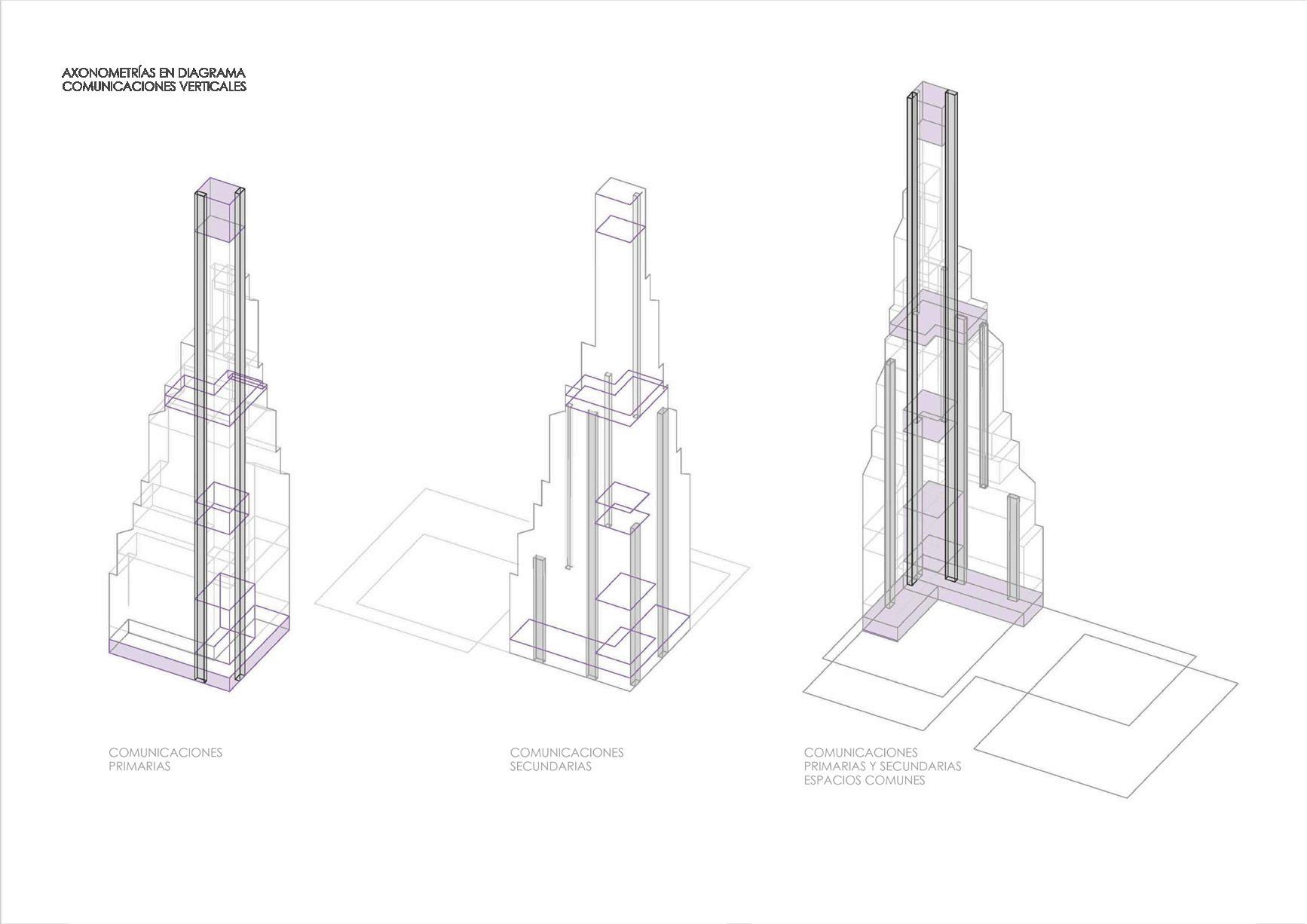 Una de las premisas del proyecto es favorecer el funcionamiento y agilidad del usuario dentro de la torre con un sistema jerárquico de núcleos de comunicación. Se establece un primer sistema de comunicación vertical de gran escala que comunica directamente la parte superior de la torre con la parte inferior. Sobre este se situa uno secundario que accede a los espacios comunes de los distintos usos y , por último, uno distribuidor de menor escala que brinda acceso ya específico a cada planta