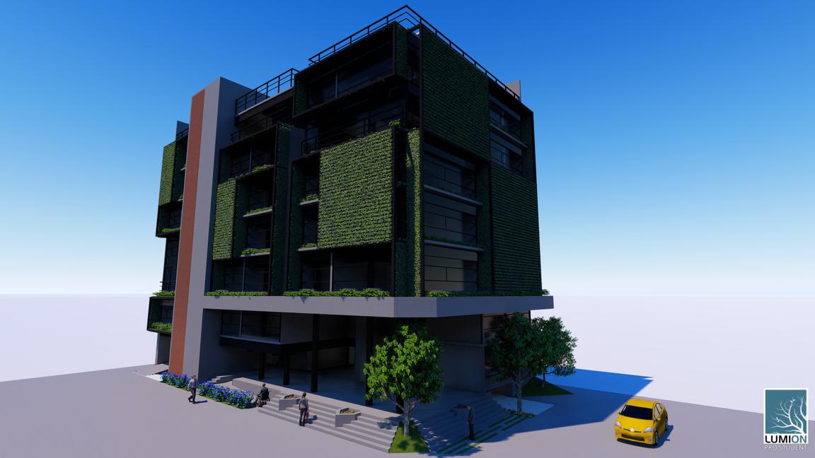 4.La incorporación de vegetación es pilar para el diseño de la torre en un lote que carece de vegetación alguna. Marcos verdes acompañan las fachadas principales del proyecto de forma que generan frescura en los espacios internos, ya portan belleza al exterior.