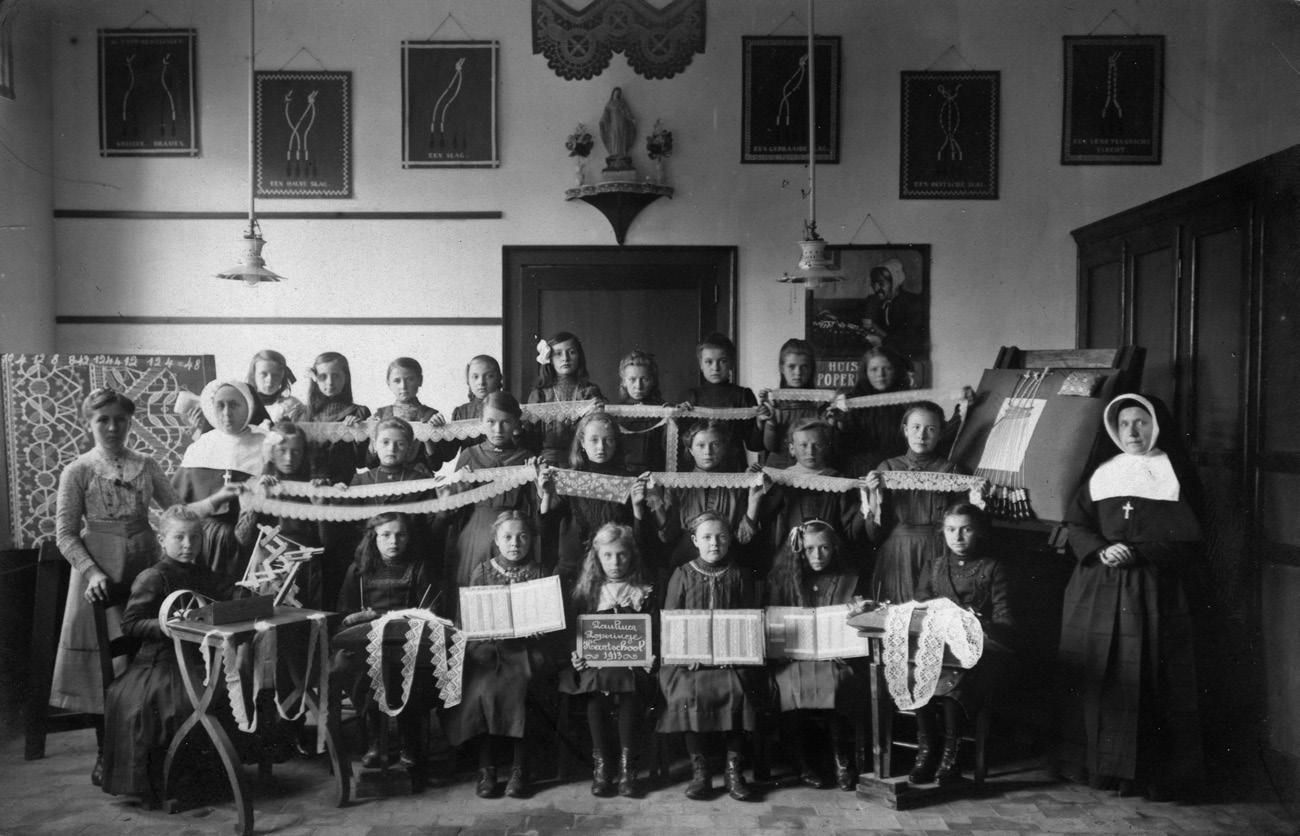 productieateliers, waar de meisjes weinig meer leerden dan kantwerken en waar de lesmethode vooral bestond uit goed kijken en nadoen.9 Hervormingen moesten leiden naar een heropleving van de Belgische kantindustrie en naar een verbetering van de slechte leef- en arbeidssituatie van de kantwerksters. De voorgestelde oplossingen voor het kantonderwijs zijn te bundelen onder drie thema’s: een professionalisering van het onderwijs, een grotere aandacht voor het welzijn van het kind en een groeiend streven naar artistieke vernieuwingen. Concreet vertaalde dit zich onder meer in de vraag om gediplomeerde kantleraressen, ruime klaslokalen en tekenlessen.10 Lokale en nationale verenigingen, vaak met een filantropisch karakter, werden opgericht om de voorgestelde oplossingen te implementeren en zo de neerwaartse spiraal te doen keren. De meest bekende was de rond 1910 opgerichte Les Amies de la Dentelle die onder bescherming van koningin Elisabeth stond. De adellijke en burgerlijke voortreksters van deze vereniging wilden actie ondernemen om het gebrekkige onderwijs te hervormen, de lange schooluren te verminderen en de lage lonen te verhogen. Om hun doel te bereiken eisten ze het recht om de scholen te inspecteren, die ze vervolgens een subsidie toekenden of weigerden. Daarnaast ijverden ze voor de oprichting van een kantontwerpschool en een kantnormaalschool.11 De eerste was in 1908 in Brussel opgericht en concentreerde zich op het tekenen van artistieke patronen.12 De tweede ontstond in 1911 in Brugge en legde zich toe op de opleiding van kantleraressen en op de ontwikkeling van nieuwe lesmethodes.13 Op de lange termijn haalden al de genomen acties weinig uit, want na een korte heropbloei tijdens de Eerste Wereldoorlog verdween de Belgische kantindustrie definitief in de 20e eeuw. Desondanks bleven verschillende kantscholen nog tot het begin van de jaren 1970 bestaan. Toch is er nauwelijks onderzoek gevoerd naar het kantonderwijs in Vlaanderen tijdens de 20e eeuw, naar de manier waarop de geadviseerde oplossingen door individuele kantscholen werden geïmplementeerd of naar de effecten ervan op lange termijn.14
