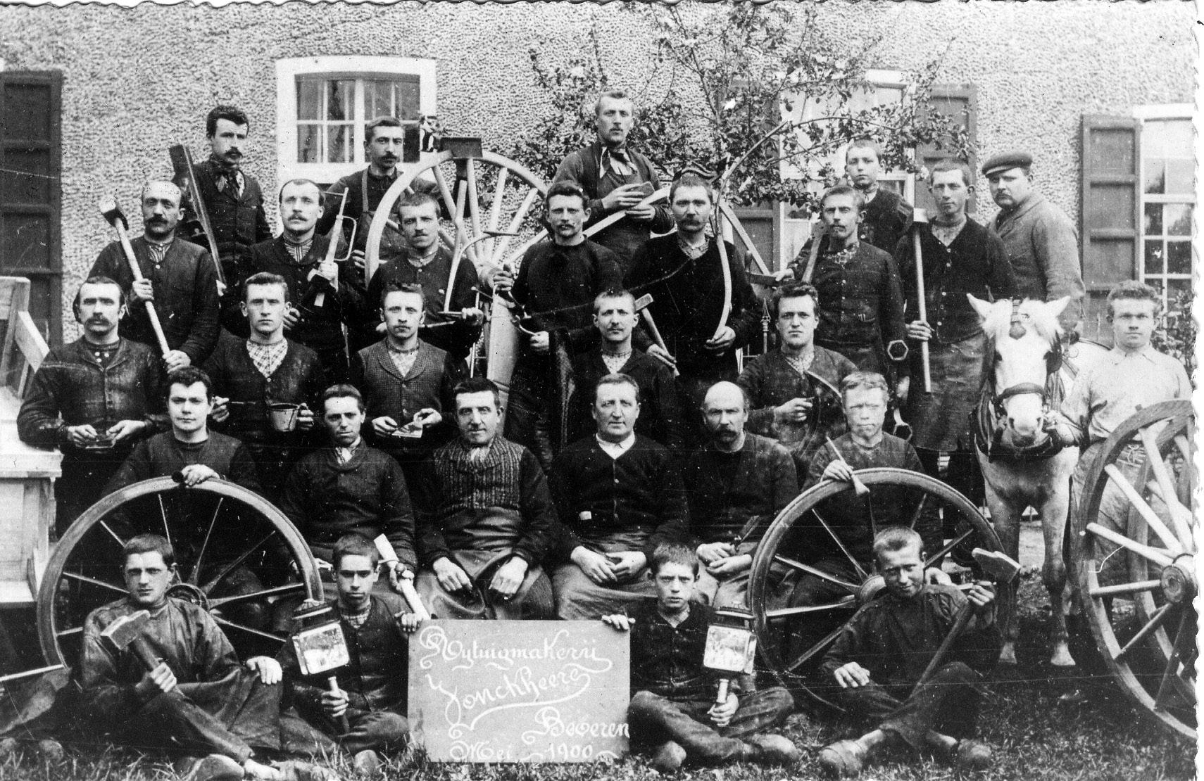 After the Second World War, the profession of wheelwright rapidly declined. In Belgium, the number of wheelwright manufacturers fell from around 2,600 in 1947 to around 50 in 1970. The main cause was the spread and further application of rubber pneumatic tyres and the use of metal bodies. Wooden vehicles also proved unsuitable for mounting behind tractors, which made a widespread from the 1950s onwards. The cartwrights’ unions – which had sprung up all over the country since the beginning of the 20th century – were not strong enough to turn the tide. Technical and industrial progress meant that craftsmanship was definitely declining. Many cartwrights saw the changes in their profession coming and decided to retrain or re-orientate themselves. Some evolved into bicycle makers or started a shop. A certain number of craftsmen made the switch and evolved into bodywork manufacturers and garage owners. Others remained in the wood sector and went working as carpenters. Wheelwrights also ended up in timber merchants, the furniture sector and the funeral industry. Only those who were sufficiently flexible had a chance of survival. Reconversion ensured continuity and change. The decline of the cartwright industry is not therefore a thing of past glory, but rather of hidden brilliance.