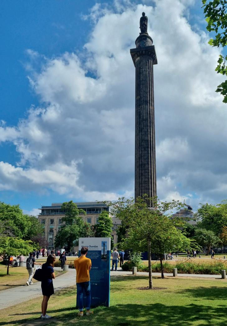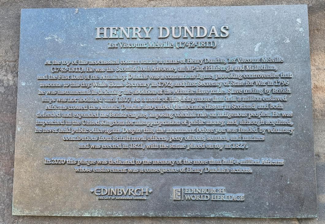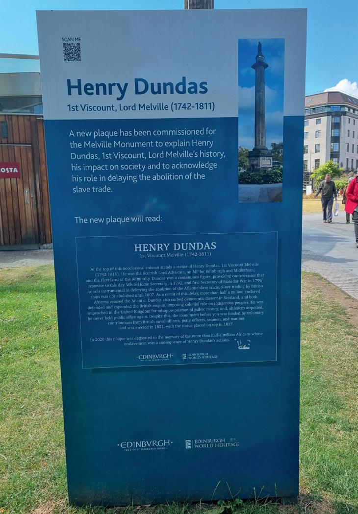 Er was recent iets gebeurd waardoor de maat vol was. Niet in Edinburgh, maar in het land waar Donald J. Trump toen president was, meer bepaald in Powderhorn te Minneapolis (Minnesota, Verenigde Staten) op 25 mei 2020: de verstikking van een man van kleur door een meer dan acht minuten durende kniehoudgreep, door een (“wi e”) politieagent. Volgens een winkelbediende zou George Floyd – die wegens COVID-19 net zijn baan in een restaurant was verloren – met een vervalst brie e van 20 dollar proberen te betalen hebben; het kos e hem zijn leven. Derek Chauvin, de politieagent, zou een jaar later wegens doodslag (en vele voorgaande klachten over geweld in functie) veroordeeld worden tot 22,5 jaar gevangenisstraf. De familie van Floyd kreeg als schikking 27 miljoen dollar van Minneapolis. De scène van de langzame dood en de woorden I can’t breathe waren door een getuige met een smartphone gefilmd en direct op Facebook Live gezet. Dit ging viraal op nieuwe en daarna de oude media. Het was alsof een trekker werd overgehaald. Op tal van plaatsen, zowel in als buiten de Verenigde Staten vonden protesten tegen racisme, politiegeweld, ongelijkheid en discriminatie plaats. Black lives ma er werd als slogan in allerlei contexten ingezet. Hierbij werden ook hedendaagse symbolen en objecten, ook erfgoed, aangevallen en aangeklikt om de handel en exploitatie in tot slaaf gemaakte mensen en kolonialisme in het verleden aan te klagen. Allerlei groepen, organisaties en overheden voelden zich geroepen, aangevuurd of gedwongen om stelling te nemen: controverses werden wereldwijd in de publieke ruimte uitgevochten en/of behandeld. Zo ook in Schotland. Graffiti, verf, relletjes, protest! Het antwoord van het stadsbestuur was te lezen op het duidende opschri dat in oktober 2021 werd aangebracht op het Melville-monument. Henry Dundas (1742-1811) was de eerste “Viscount Melville”. Hij was al veelbesproken tijdens zijn leven als politicus en imperialist. Na zijn dood probeerden zijn medestanders en vooral leden van de Britse marine die hij bevoordeeld had, gedenktekens op te richten. Forse opstaande reuzepalen bleken daarbij een geliefd beeld te zijn, zoals blijkt uit de erectie van een obelisk op de Duniragronden in Comrie, Pertshire. Wat Dundas vandaag door sommige mensen bijzonder kwalijk wordt genomen is het feit dat hij in het Britse Lagerhuis, als parlementslid, de inspanningen om de slavenhandel af te schaffen had gedwarsboomd, toen William Wilberforce tussen 1792 en 1796 daarvoor ijverde. Voor dergelijke herinneringen aan iets wat niet gebeurde of misschien sterk vertraagde, was er nu geen ademruimte meer. Maar verwijderen van de standbeeldconstructie was heel moeilijk omwille van de bescherming als Categorie A-monument sinds 1966. Sinds 1995 was zowel de oude als de nieuwere binnenstad van Edinburgh ook ingeschreven