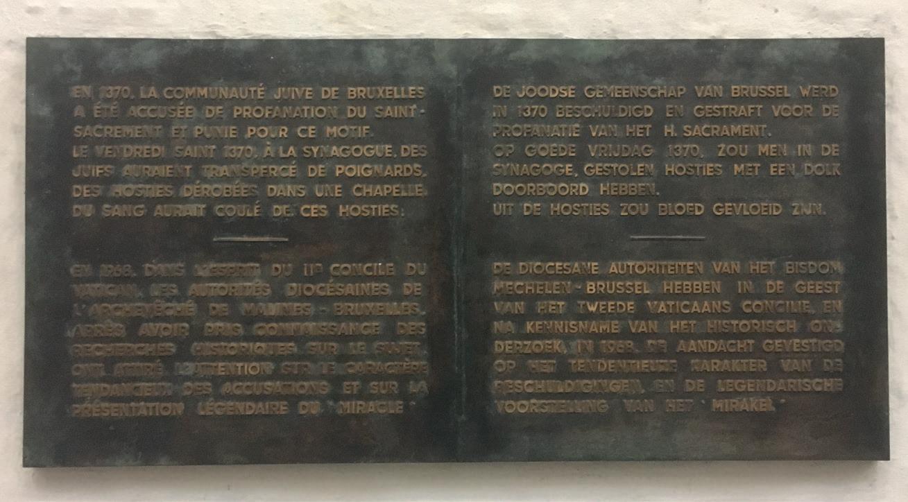 This article explores the link between heritage, antisemitism, and controversies. It discusses the material traces in the city of Brussels referring to a medieval legend of the Sacrament of Miracle, including stained glass, plaques, and buildings. Several opinions about the link between heritage and antisemitism are reviewed. How problematic are the remaining relics and traces in the city of Brussels and even in a building where among others a library of the European Commission is based? Should this be explicitly addressed or rather problematized?