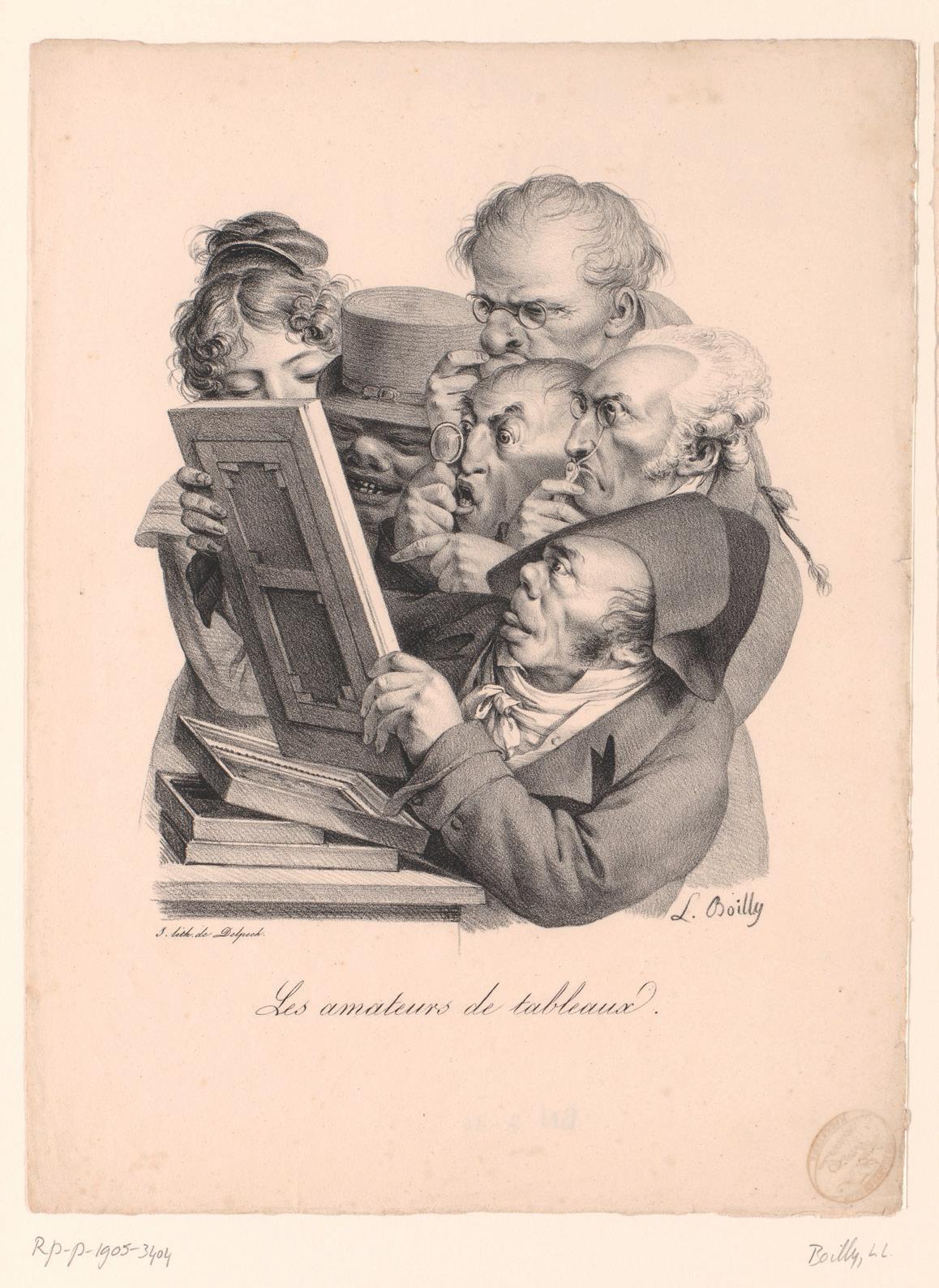 De bovenstaande, rechtenvrije afbeelding, die in toegeëigende vorm ook op de voorpagina is gebruikt, is een Karikatuur van zes liefhebbers van schilderijen, Louis-Léopold Boilly, Parijs/ Amsterdam, 1823, Rijksstudio, Rijksmuseum Amsterdam, RP-P-1905-3404.