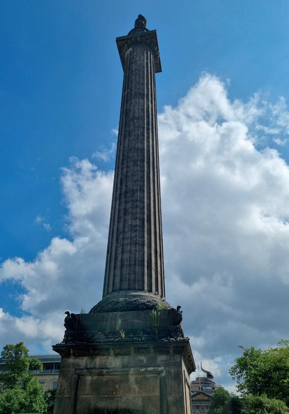 De zomer van 2022 in Edinburgh. Je ziet het, hem eigenlijk, al van verre staan, op een bijna 46 meter hoge zuil, midden op een groot grasplein in de wijk New Town, in het centrum van de Schotse hoofdstad. Op Saint Andrew Square komen verschillende grote luxewinkelstraten en residentiële lanen samen. Het is ook de plek waar minstens vijf hop-on-hop-off-bustours vertrekken en aansluiting bieden voor duizenden toeristen per dag. Je moet heel dichtbij komen en goede ogen hebben om het donkerkoperen opschri te kunnen lezen dat op de sokkel is gevezen, om te zien wie het was: Henry Dundas, 1742-1811. Of wat het is: het Melvillemonument opgericht tussen 1821 en 1827, naar verluidt dankzij gi en van officieren van de Royal Navy. In 2008