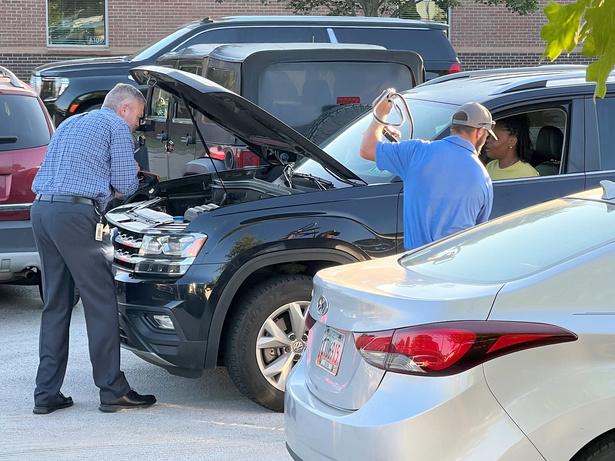 PCSD Superintendent Steve Barnette helping a parent with car trouble on the first day of school