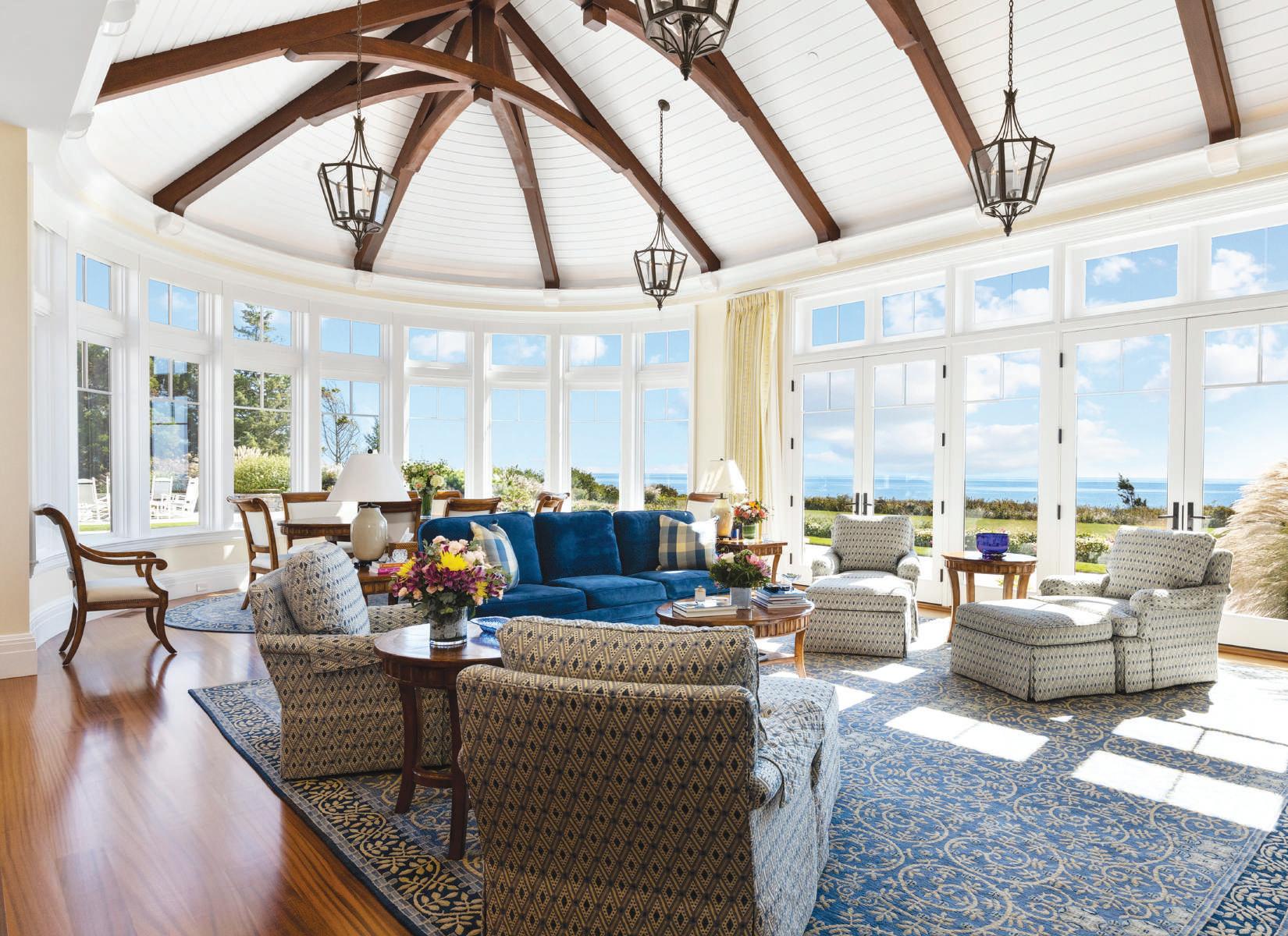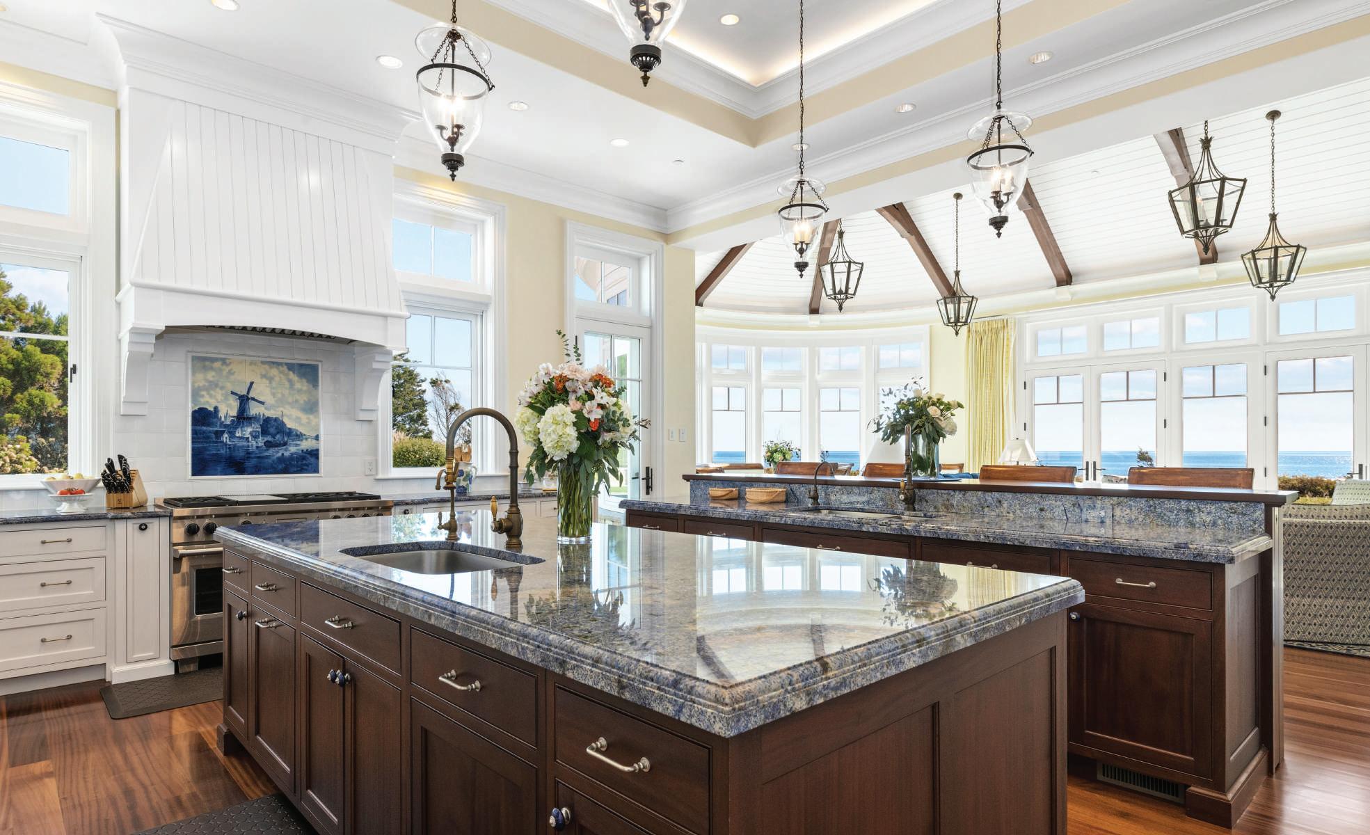 In the family room, a beamed cathedral ceiling reminiscent of a ship’s hull showcases extraordinary craftsmanship and makes a dramatic visual statement. The informal breakfast area is ensconced by a bowed wall of windows, benefiting from one of the most awe-inspiring vantage points in the home.