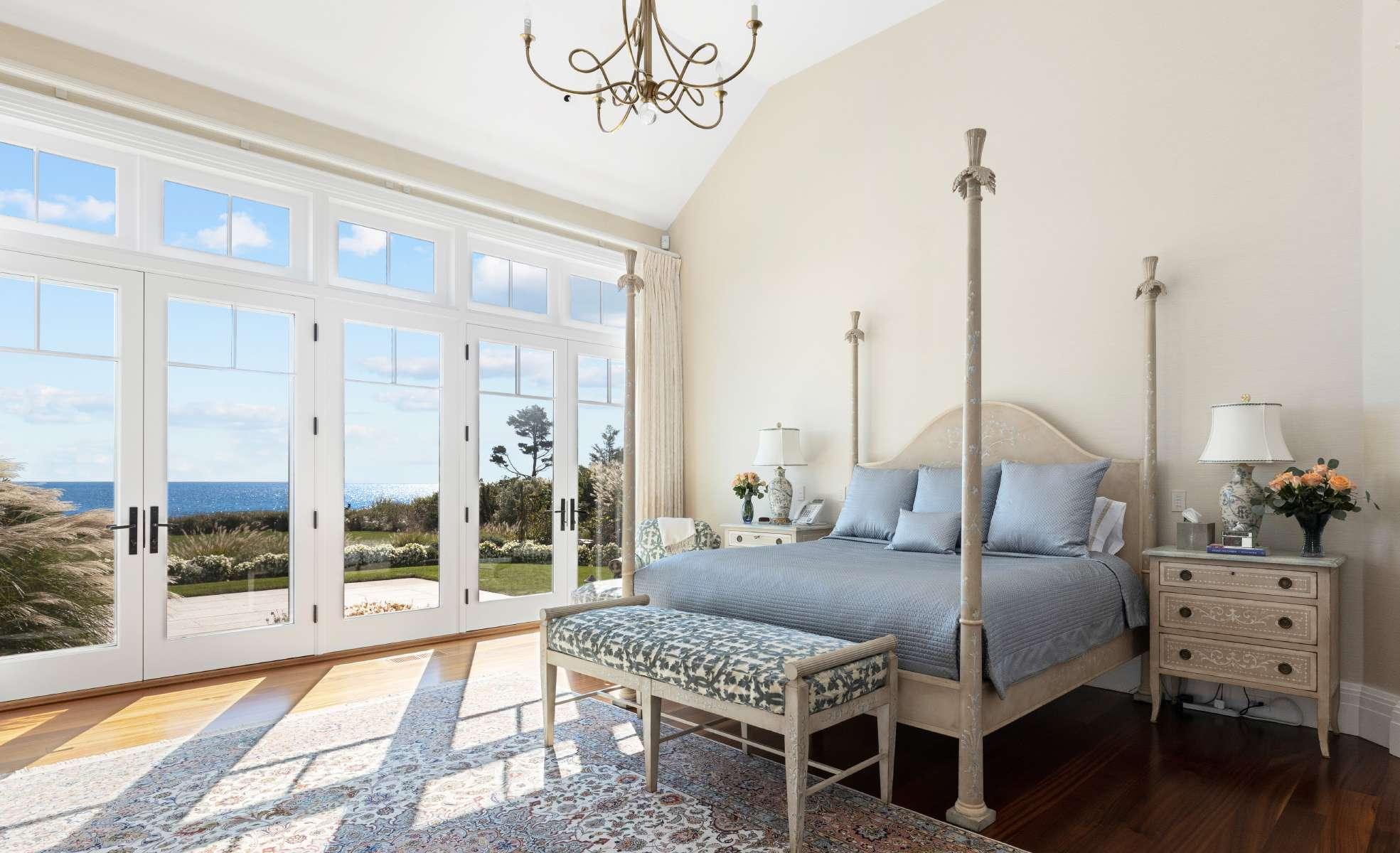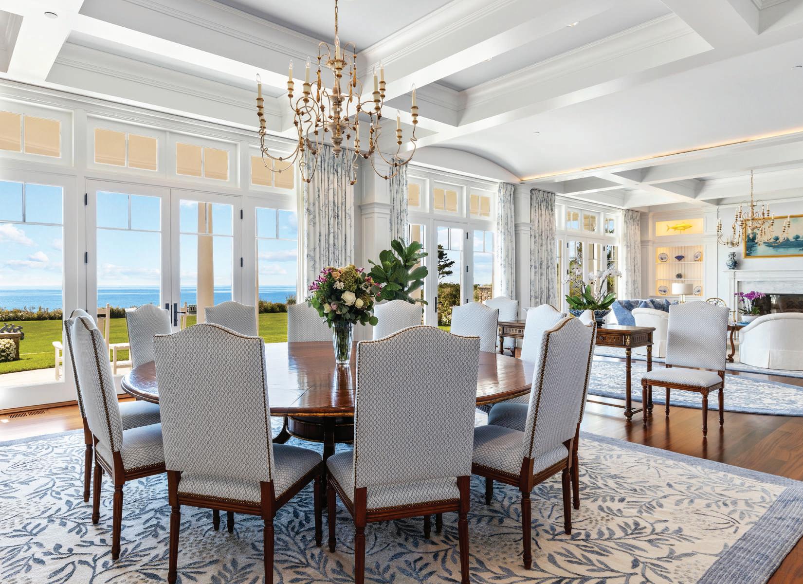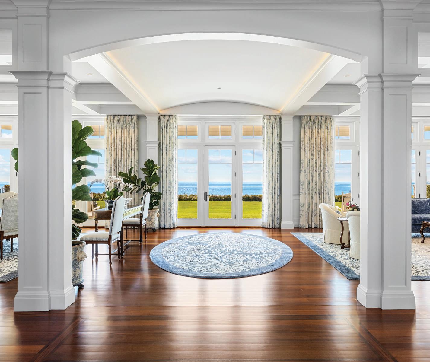 As one enters an impressive foyer, unobstructed views spanning to Martha’s Vineyard are immediately on display. A seamless layout flows into the open living and dining rooms, with floor-to-ceiling glass doors, custom made and imported from Canada. Impeccably designed with 5-inch Santos Mahogany wood floors, coffered ceilings, and opposing marble fireplaces on either end, there is a sense of warmth and sophistication that complements the enchanting backdrop.