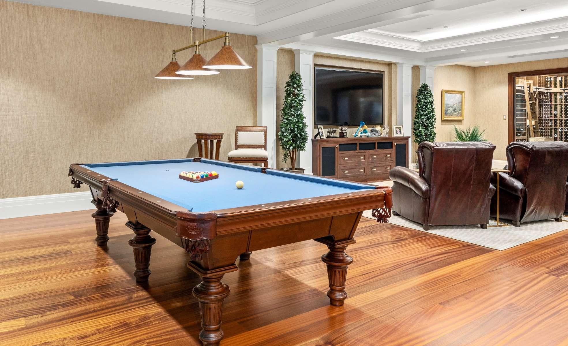 Equipped with professional grade appliances and custom mahogany cabinets, the epicurean kitchen is ideally suited for cooking and entertaining. Double islands and a large butler’s pantry ensure plentiful space, while a reclaimed delft tile backsplash and dazzling pendant lights contribute to an inviting ambience where the whole family can gather.
