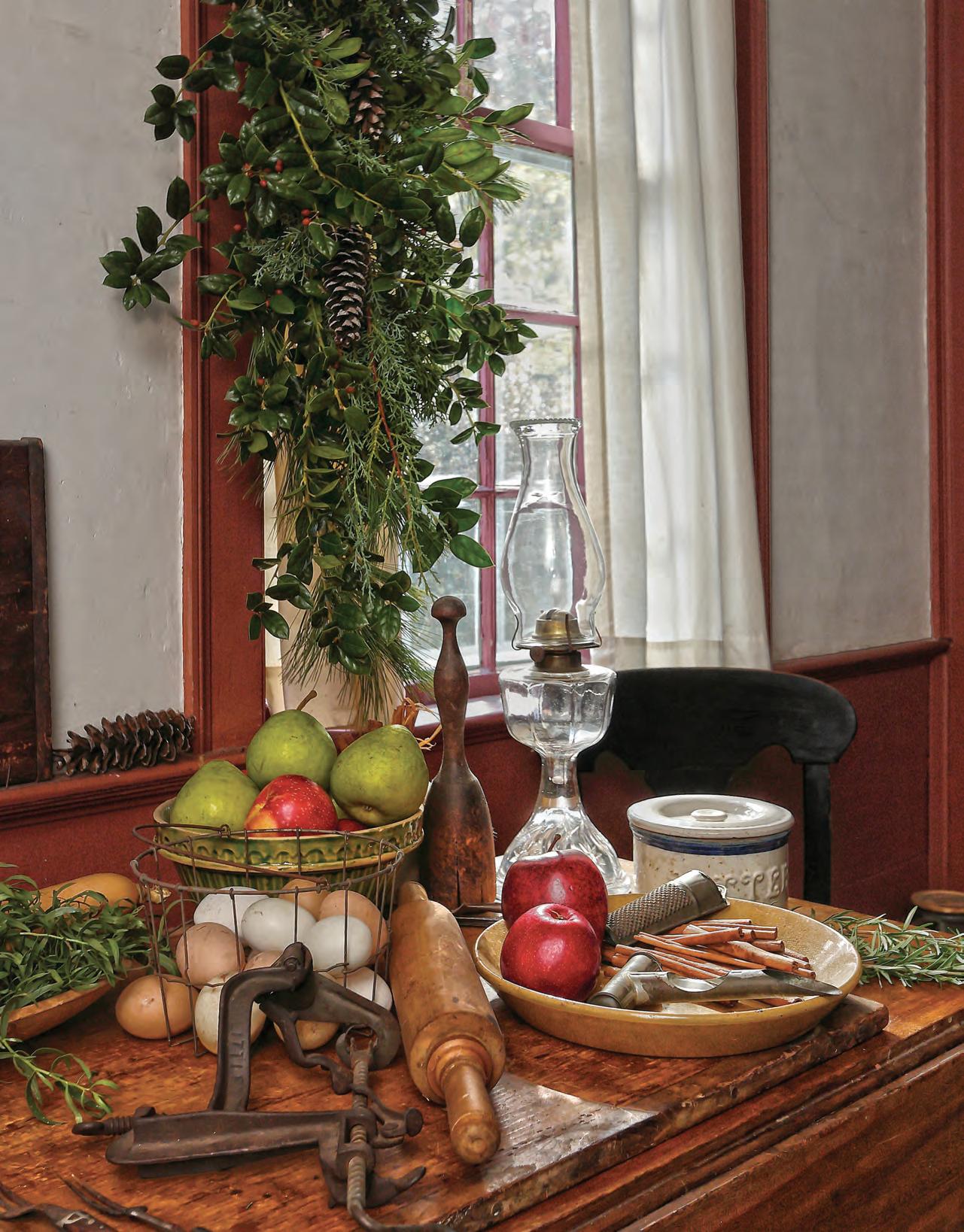 The table where food was prepared with time-period instruments in the kitchen of the Stone-Otis house, with a view into the yard. Read the House that Sits on the Corner on Page 23 about the dwelling’s first inhabitants.