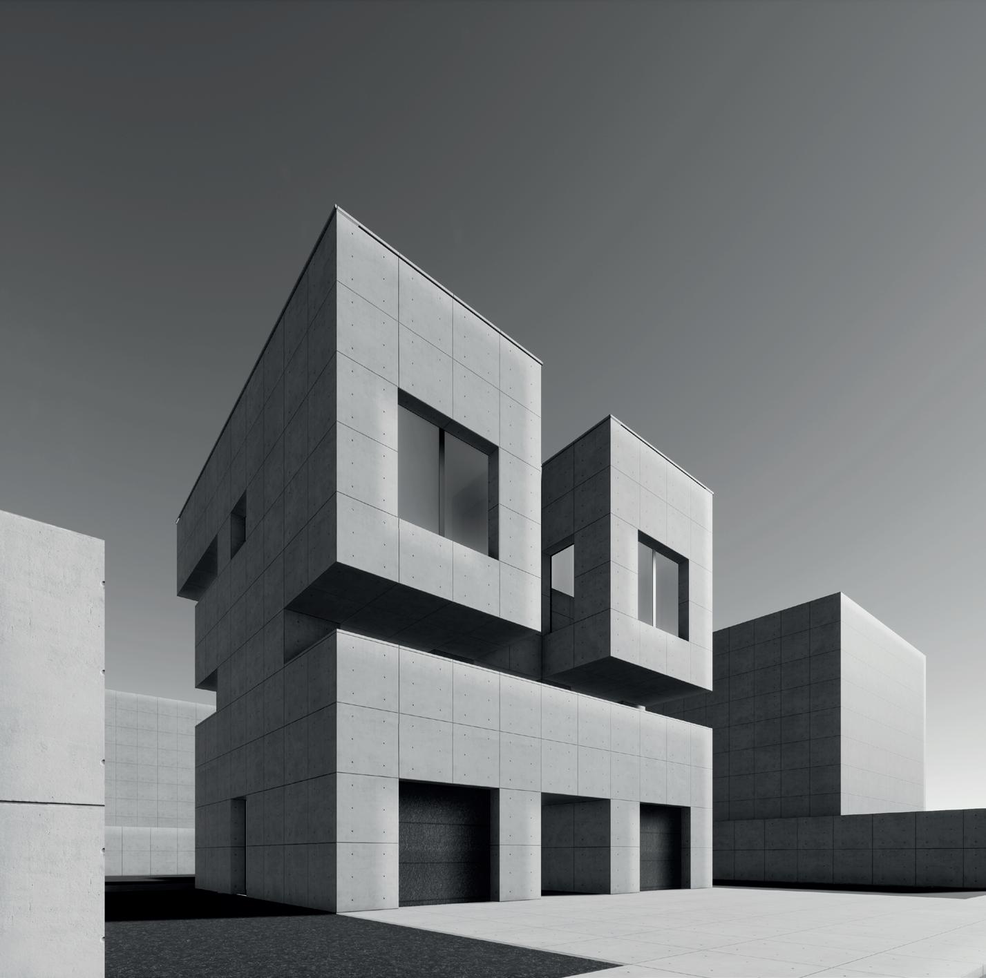 Forma składa się z trzech prostopadłościennych bloków, ułożonych na sobie i przesuniętych względem siebie, tak aby uzyskać jak najbardziej funkcjonalną przestrzeń. Koncepcję dopełnia minimalistyczne i proste wykończenie białym tynkiem.
