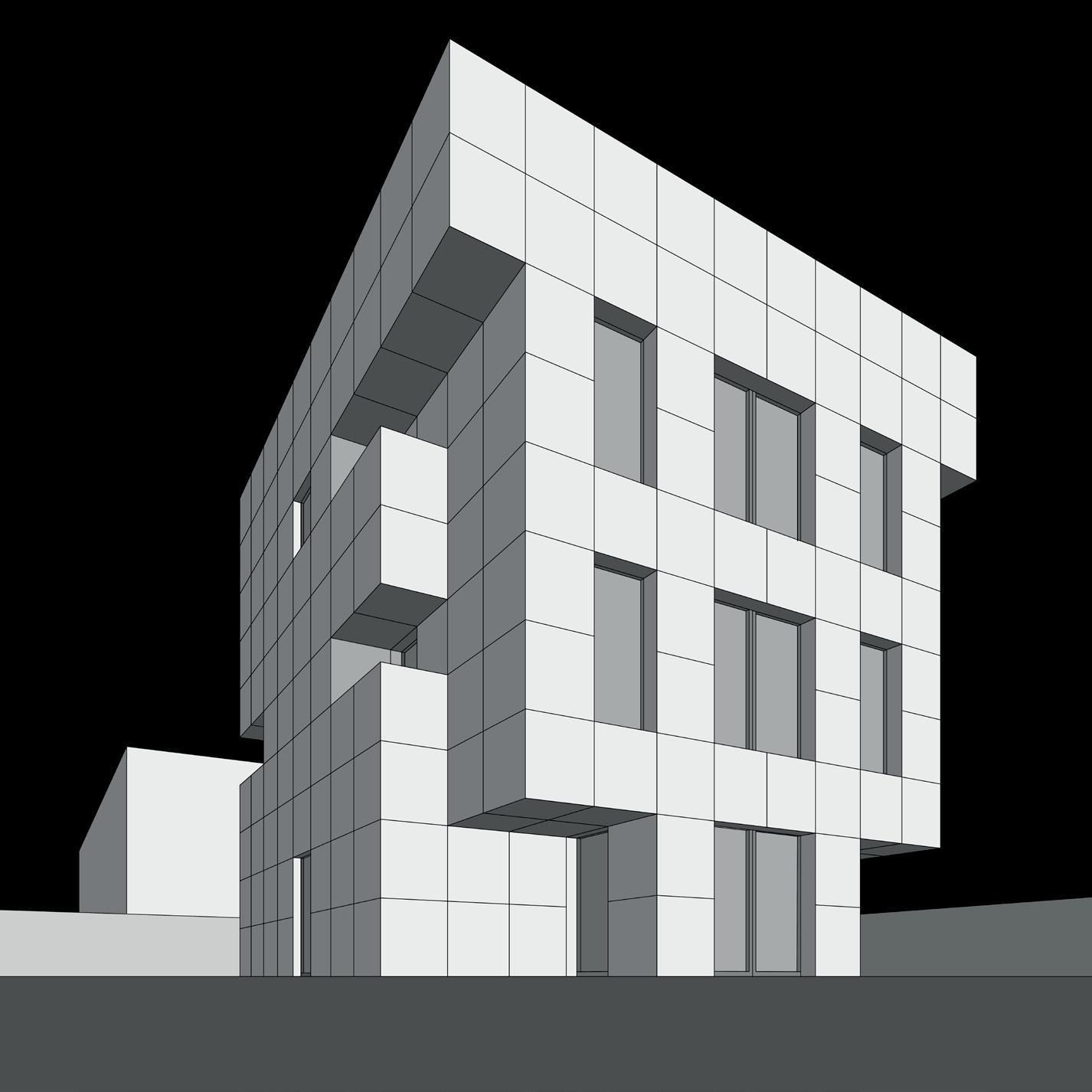 Elewacja wykonana jest z betonowych płyt elewacyjnych o wymiarach 120 cm na 120 cm, nawiązując do zastosowanego w projekcie modułu.