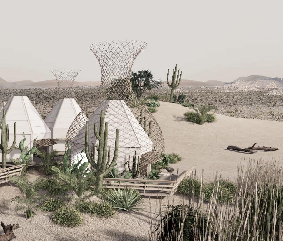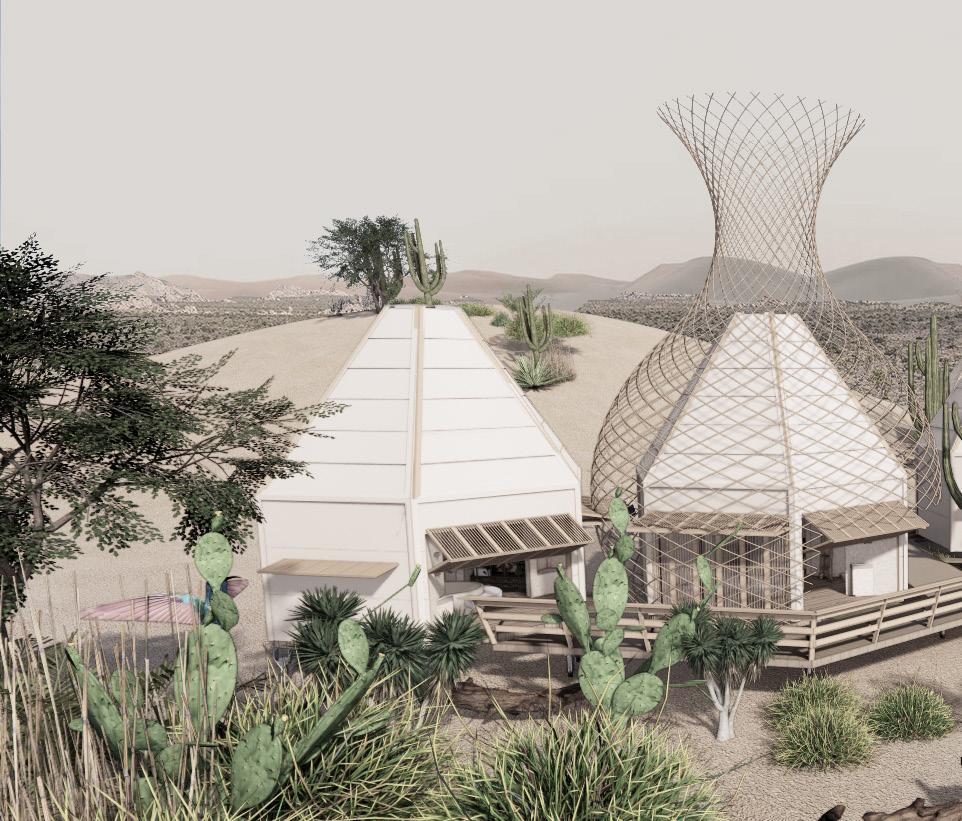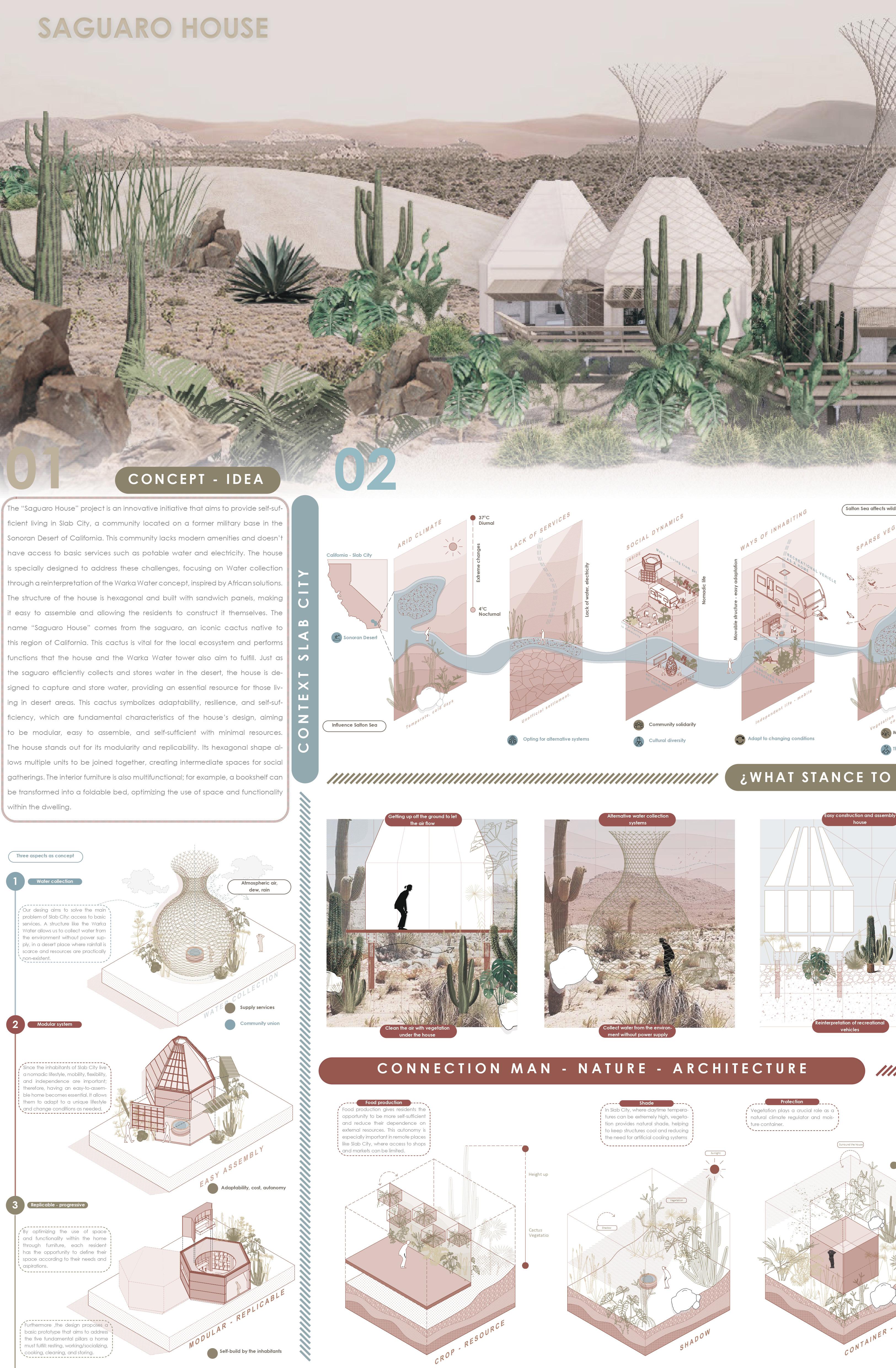 En la fase inicial, mi papel fue revisar los requisitos del concurso para comprender a fondo el encargo y llevar a cabo una investigación sobre el entorno y sobre ejemplos arquitectónicos y gráficos. Durante esta etapa, era esencial determinar las directrices fundamentales que el equipo deseaba para el diseño y el concepto general del tipo de edificio a proponer, en este caso, una tiny house situada en Slab City, California, por elección del equipo debido al desafío social, humano y arquitectónico que representaba. Esta decisión se tomó a través de sesiones diarias en los talleres de diseño.
