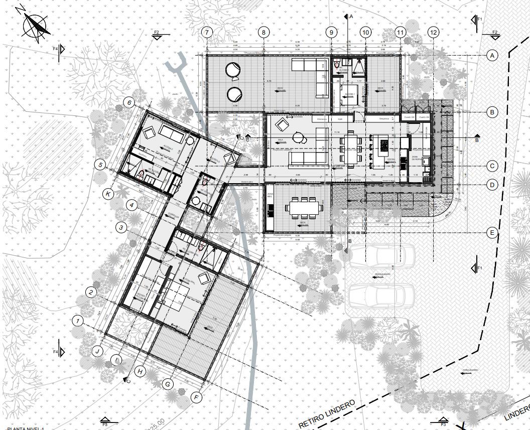 El encargo en este proyecto ubicado en el Retiro, antioquia, fue realizar una vivienda de un solo nivel con un estilo sobrio, industrial, y para ello se le hizo al cliente una propesta de diseño la cual incluía el desarrollo de toda la planimetría que sería entregada a ellos y a licencia para su aprobación, en este caso este paquete de planos estuvo a cargo mío y para ello realicé en autocad con ayuda del modelo de sketchup las plantas de localización, cubiertas, primer nivel, con sus respectivas secciones y fachadas