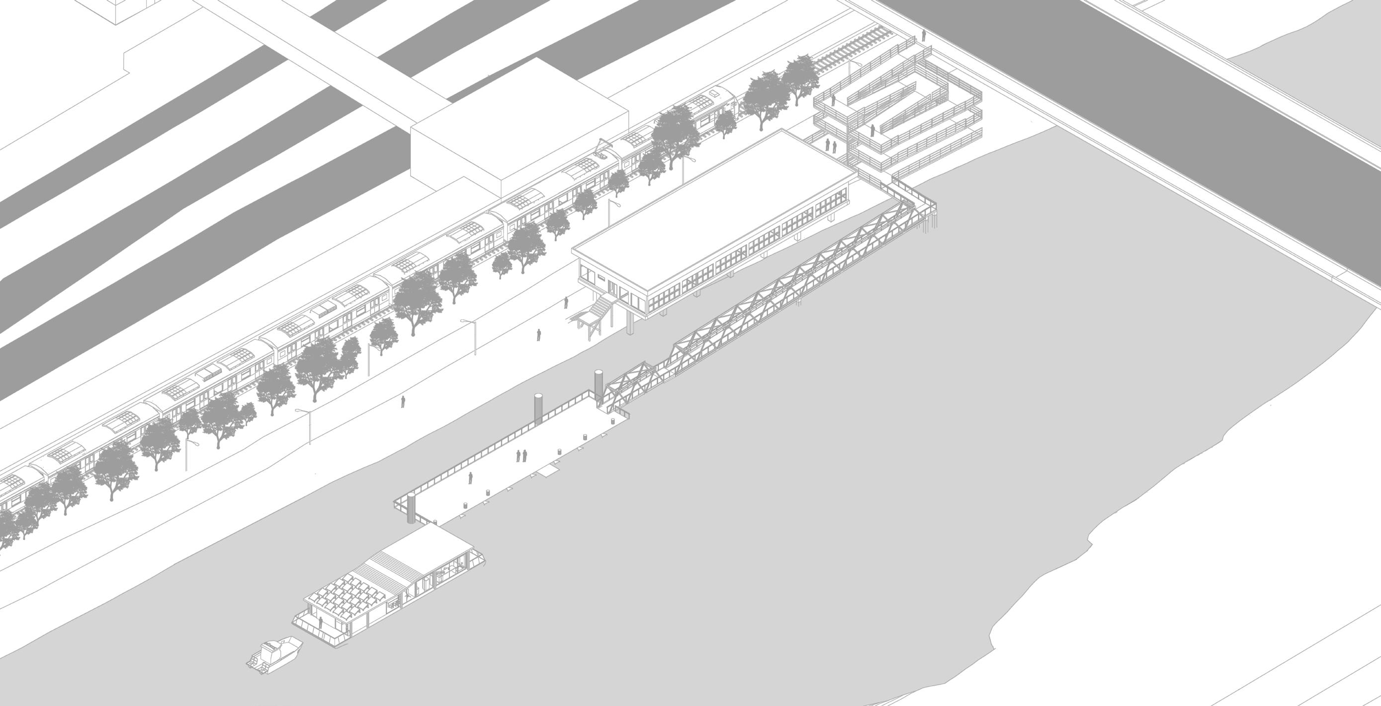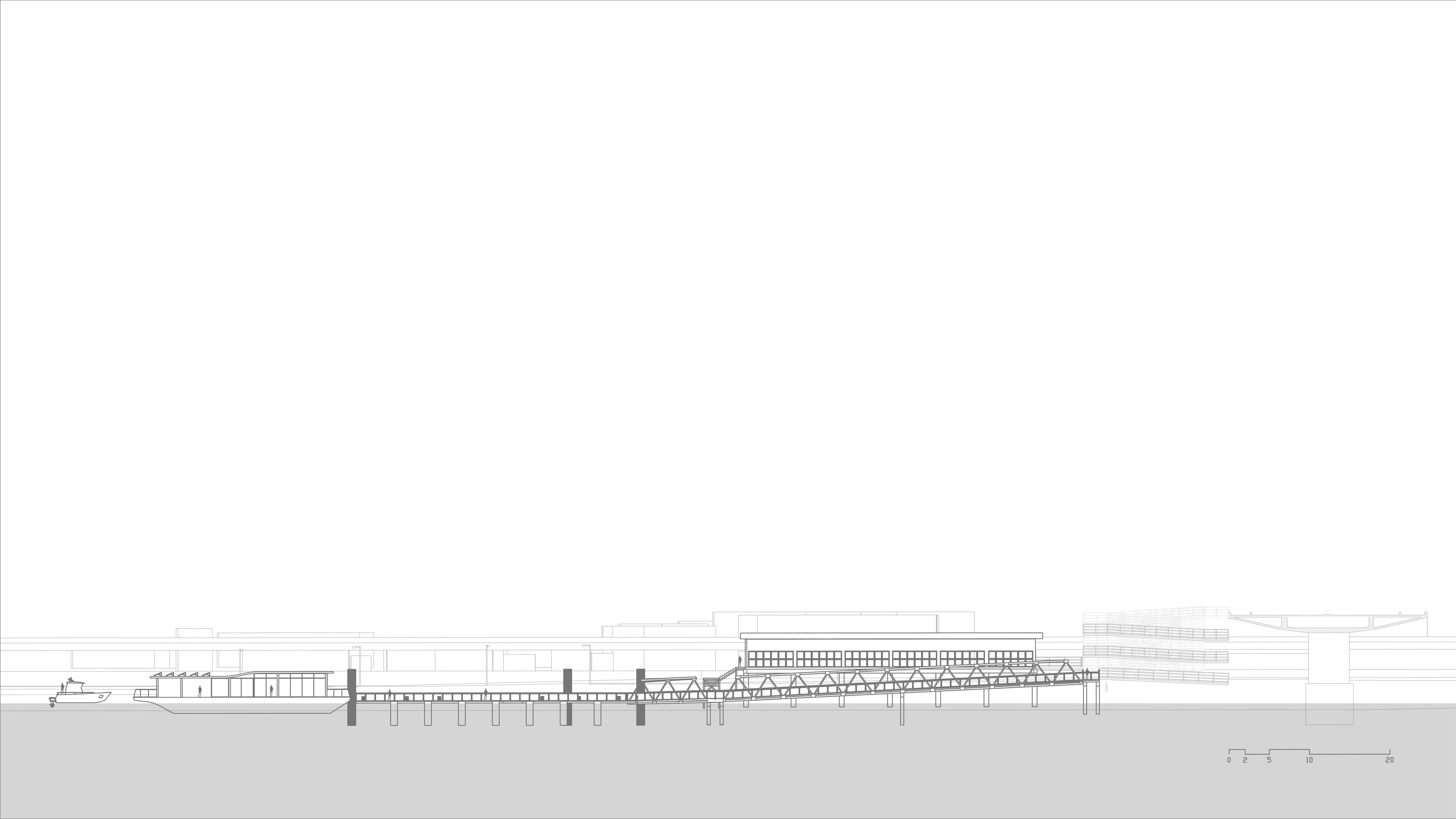 Terminal intermodal do Jardim Gazuza. Implementado numa quadra com baixa densidade de ocupação, sendo essa, apenas de pequenas industrias, o terminal funcionará como ponto de embarque e desembarque da linha circular que contorna a comunidade e também fará a ligação dos moradores com as linhas de ônibus preexistentes com destino ao centro de São Paulo. Além disso, no subsolo do terminal foi proposto um estacionamento de veículos de pequeno porte como motos e pequenos carros, para que haja um alívio no fluxo de carros dentro da comunidade, uma vez que a grande maioria das residências não possuem garagem e, desta forma, os moradores costumam deixar os veículos nas estreitas ruas, ou até mesmo em cima das calçadas, dificultando ainda mais o fluxo dos pedestres dentro do bairro.