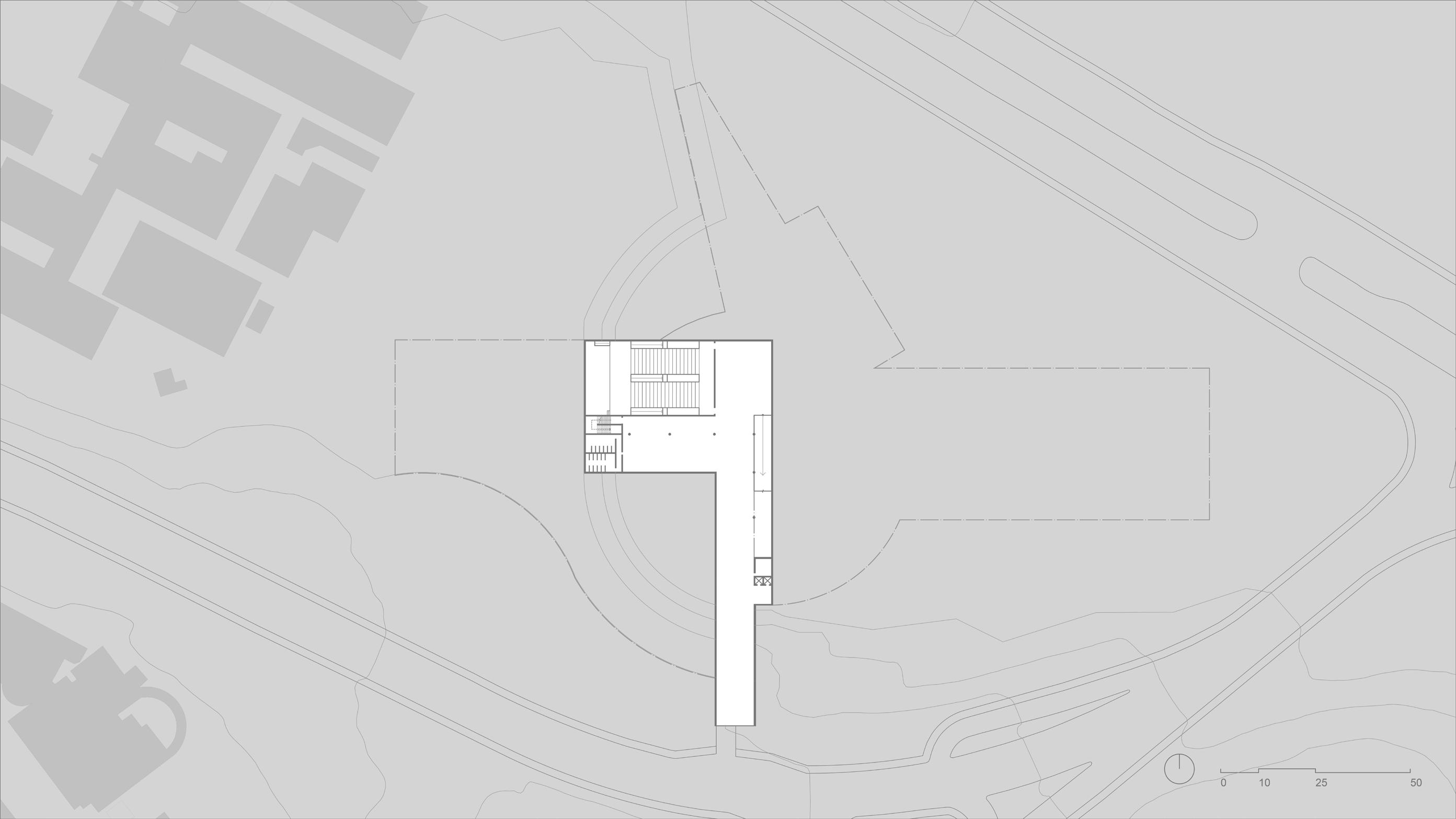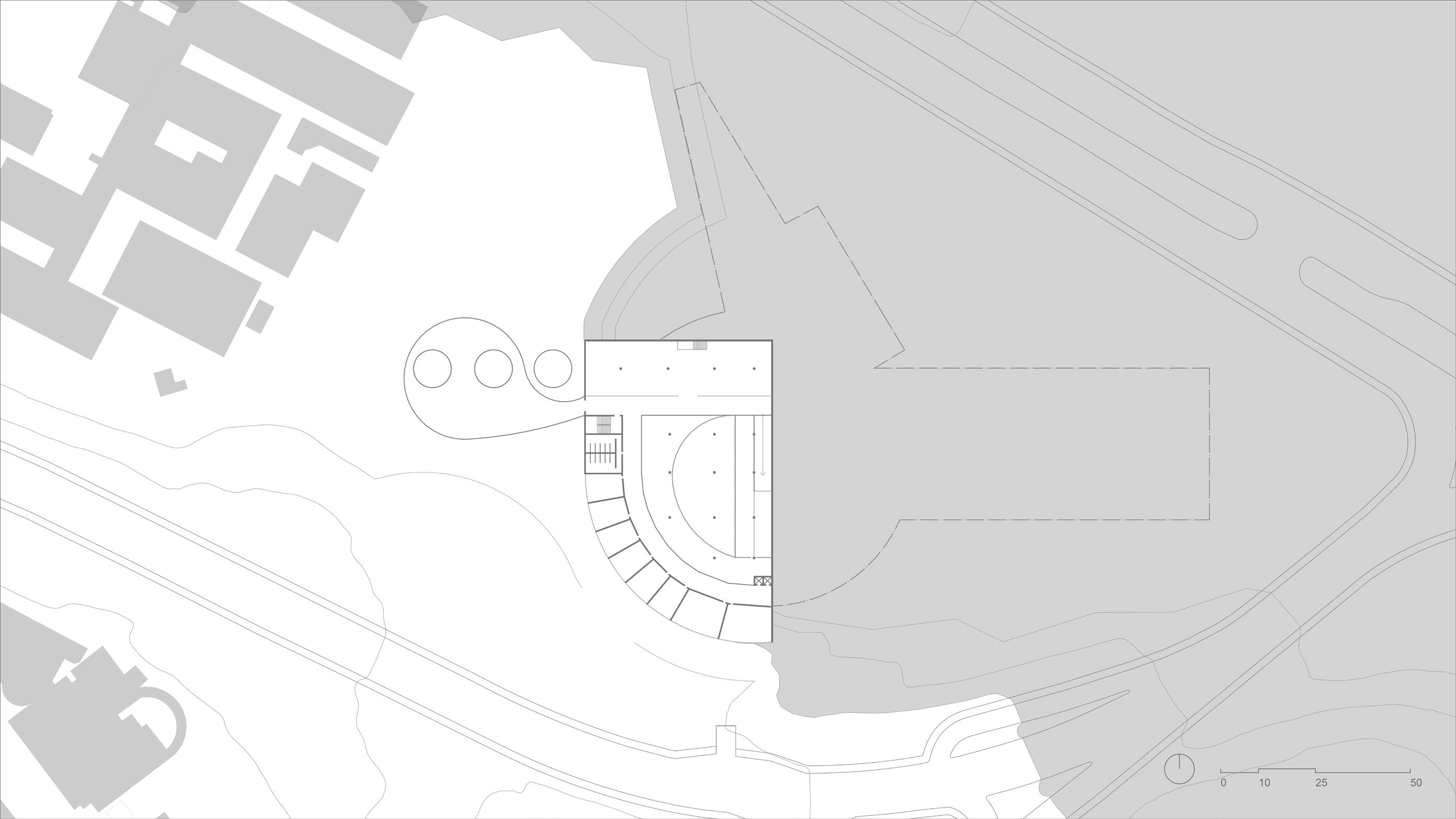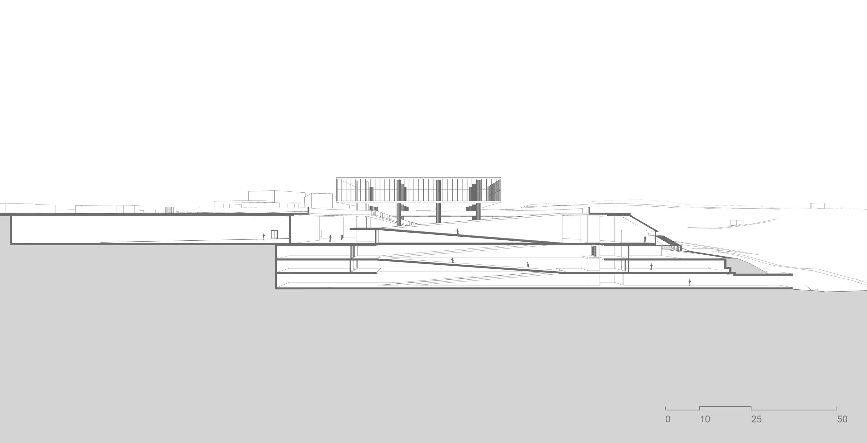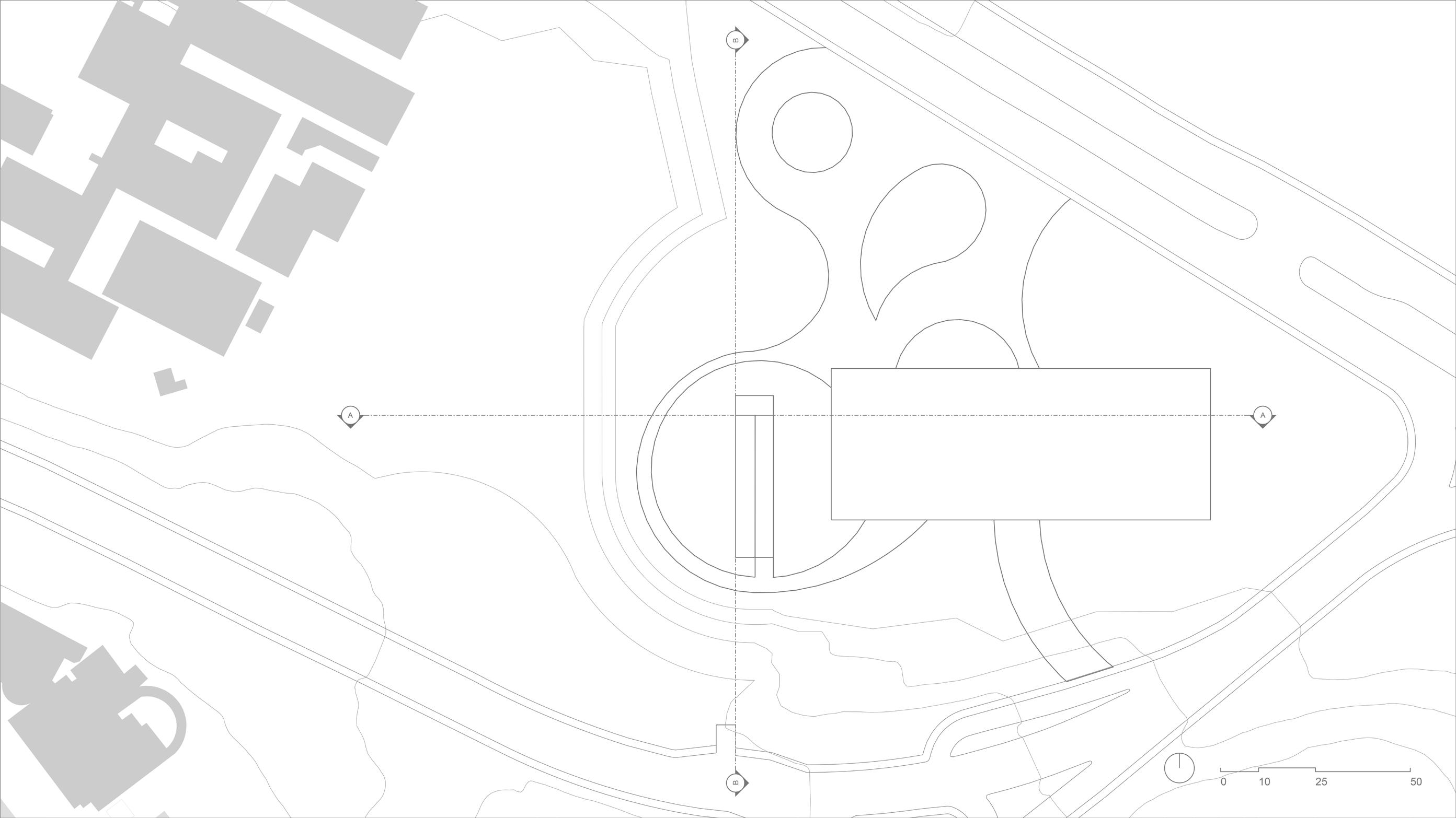 Movimentando a terra de acordo com as sugestões da topografia, enterramos um grande pátio organizador do qual edifícios-estilhaços tentam escapar, mas, como o planeta orbitando o sol, lá continuam presos. Assim, entende-se que “o belo é algo oculto. A beleza transparente é um oximoro. A beleza é necessariamente uma apa rência. Nela reside opacidade. Opaco quer dizer sombreado. A revelação desencanta e o destrói. Almeja-se esse movimento: volumes que se escondem sob a terra e voltam a se revelar, instigando o olhar a querer entender a beleza que se esconde atrás do impedimento visual. O belo, aqui, é um fato corporal, pois é acessível pelas circulações que se emaranham entre os volumes aterrados.