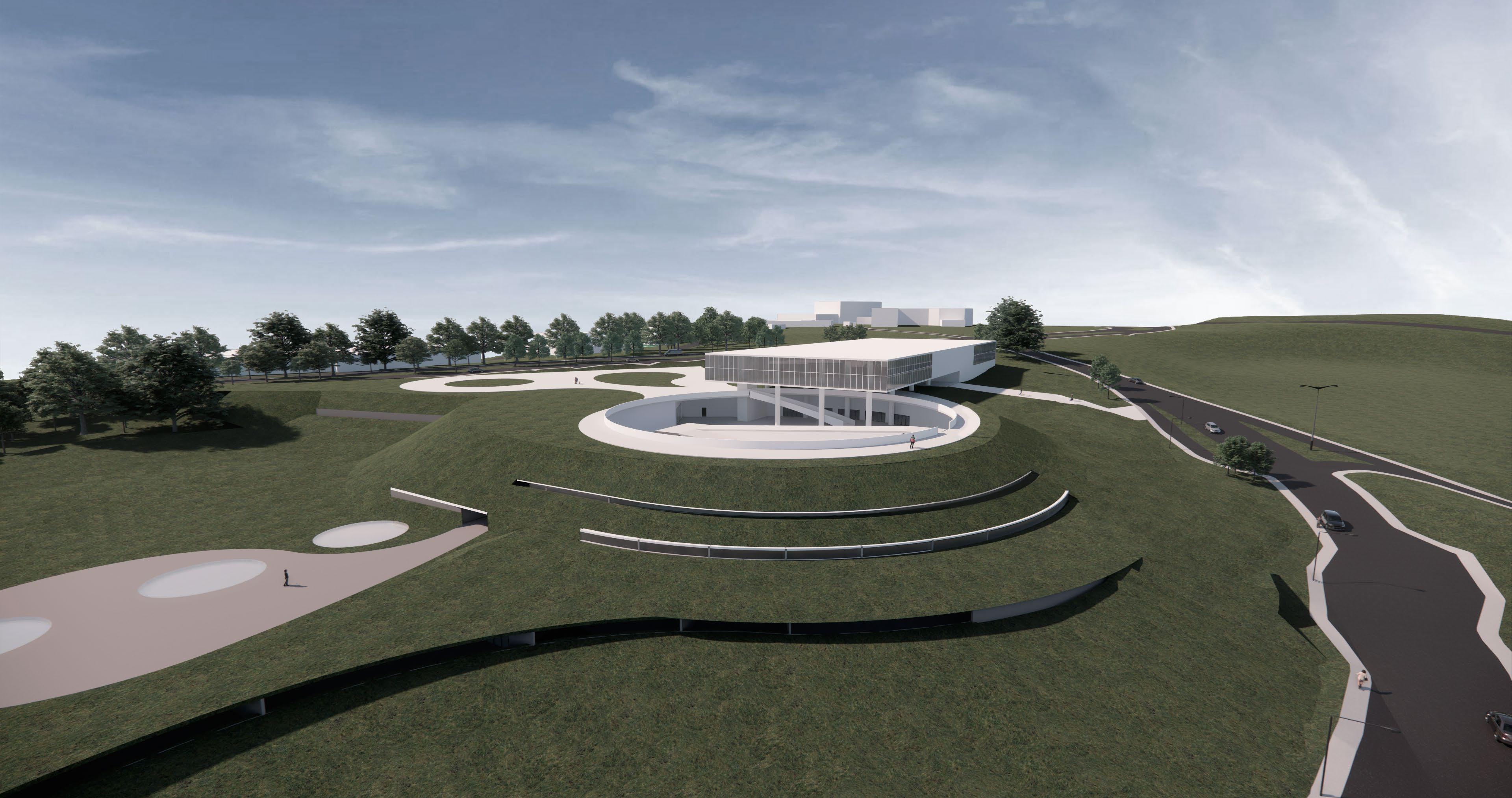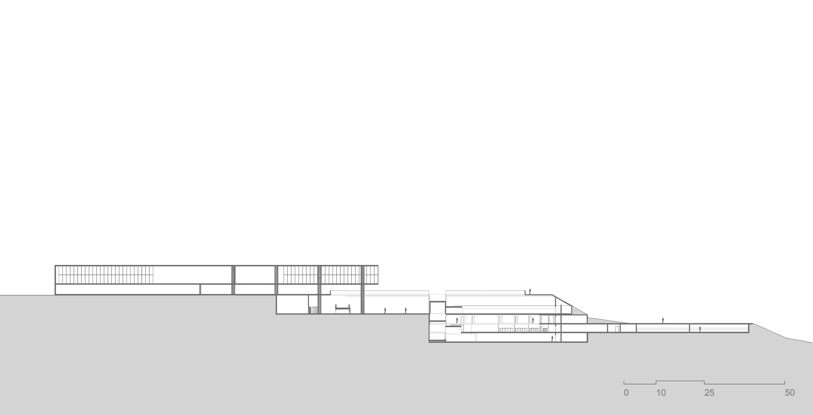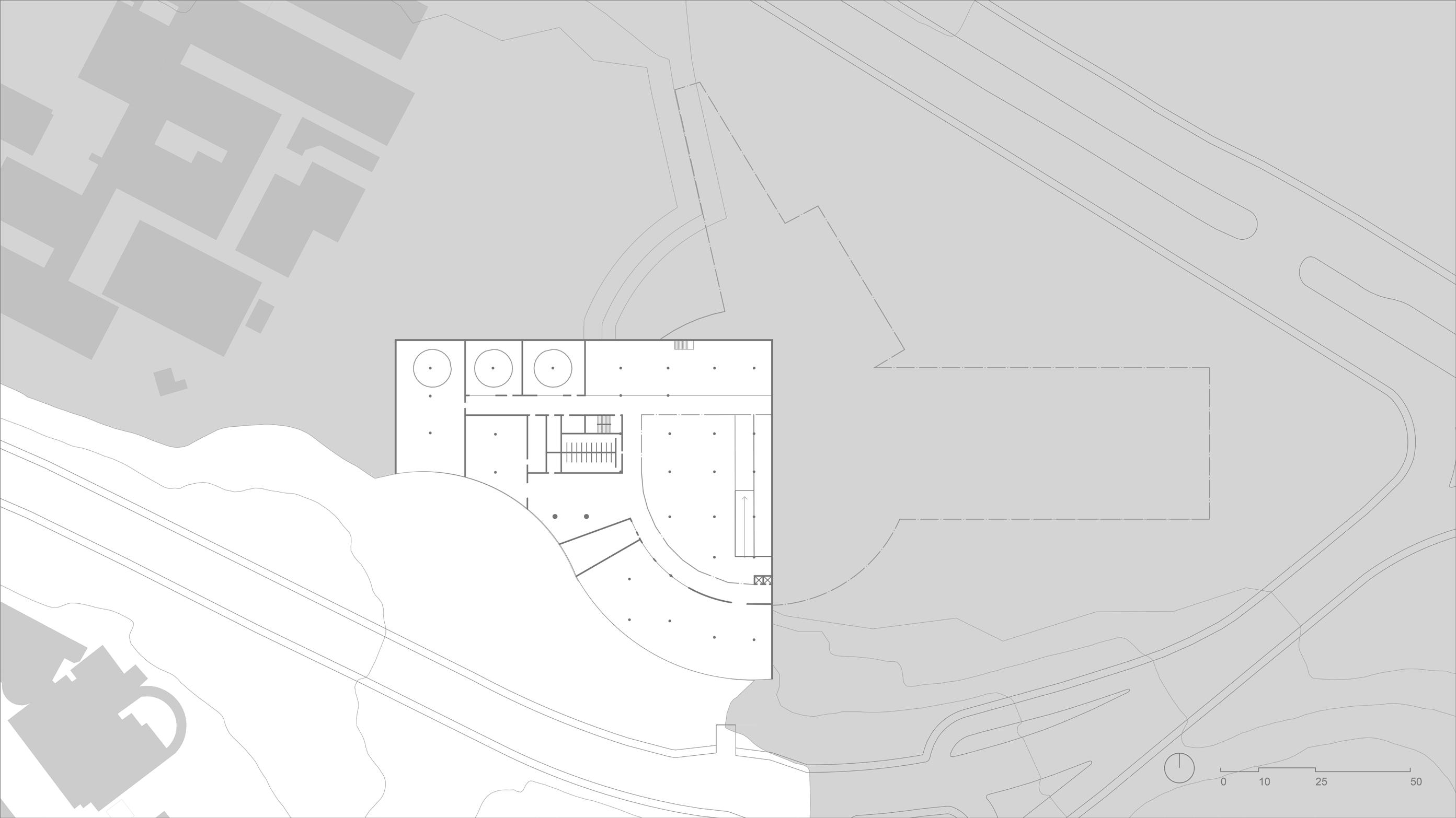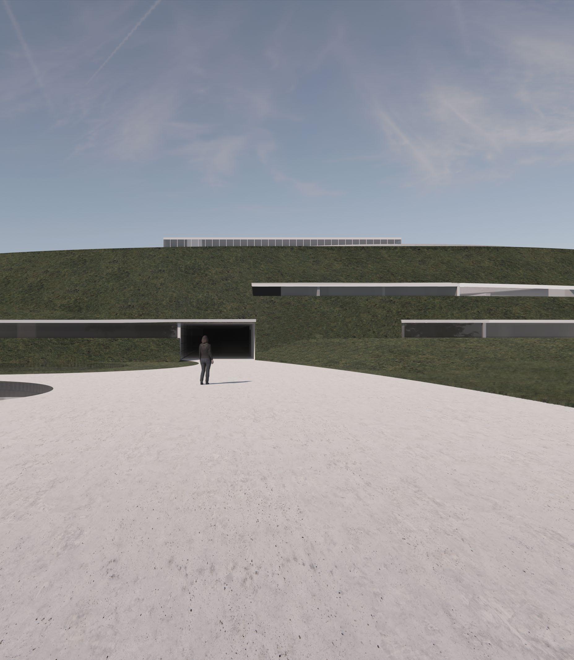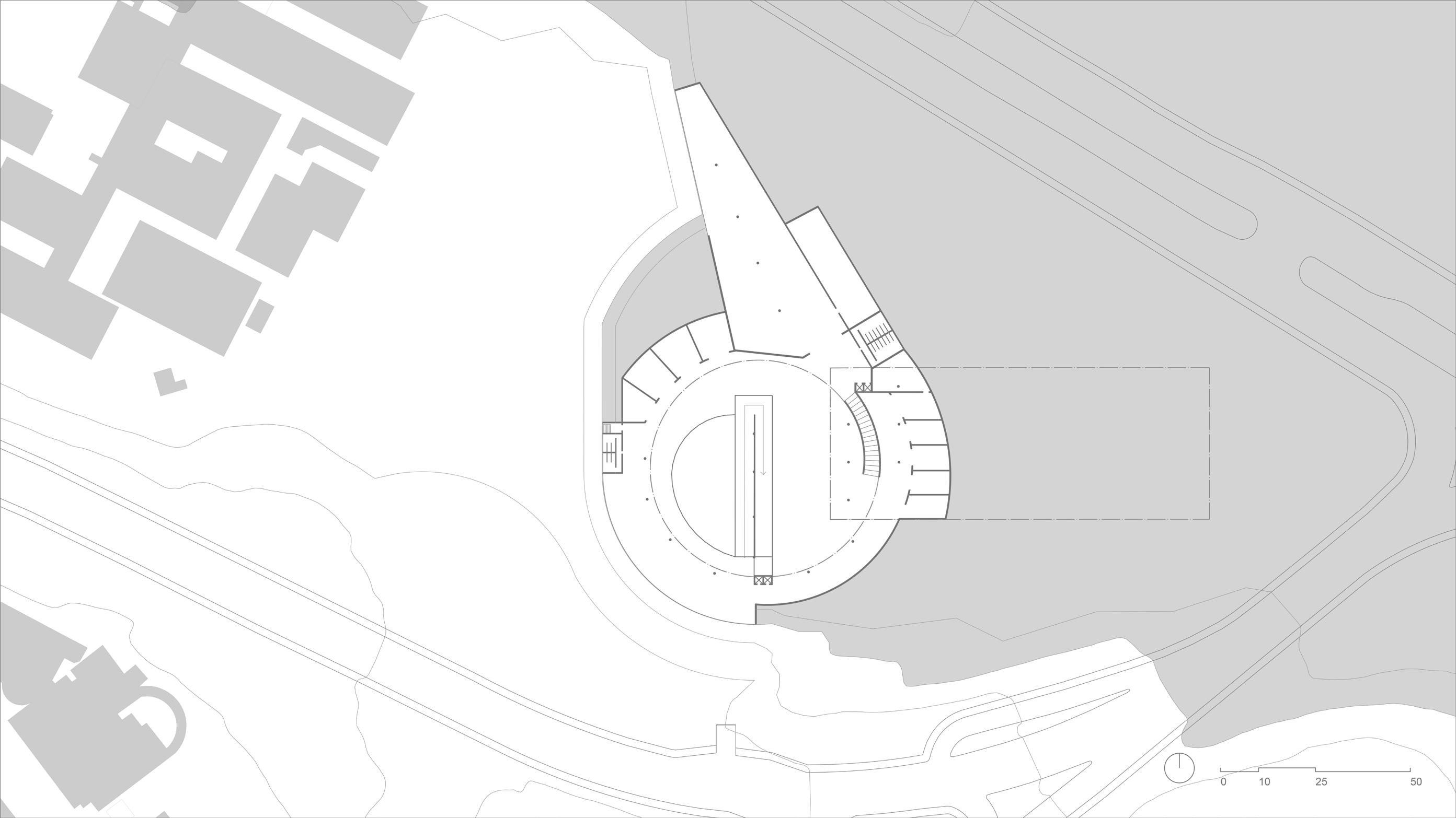 Movimentando a terra de acordo com as sugestões da topografia, enterramos um grande pátio organizador do qual edifícios-estilhaços tentam escapar, mas, como o planeta orbitando o sol, lá continuam presos. Assim, entende-se que “o belo é algo oculto. A beleza transparente é um oximoro. A beleza é necessariamente uma apa rência. Nela reside opacidade. Opaco quer dizer sombreado. A revelação desencanta e o destrói. Almeja-se esse movimento: volumes que se escondem sob a terra e voltam a se revelar, instigando o olhar a querer entender a beleza que se esconde atrás do impedimento visual. O belo, aqui, é um fato corporal, pois é acessível pelas circulações que se emaranham entre os volumes aterrados.