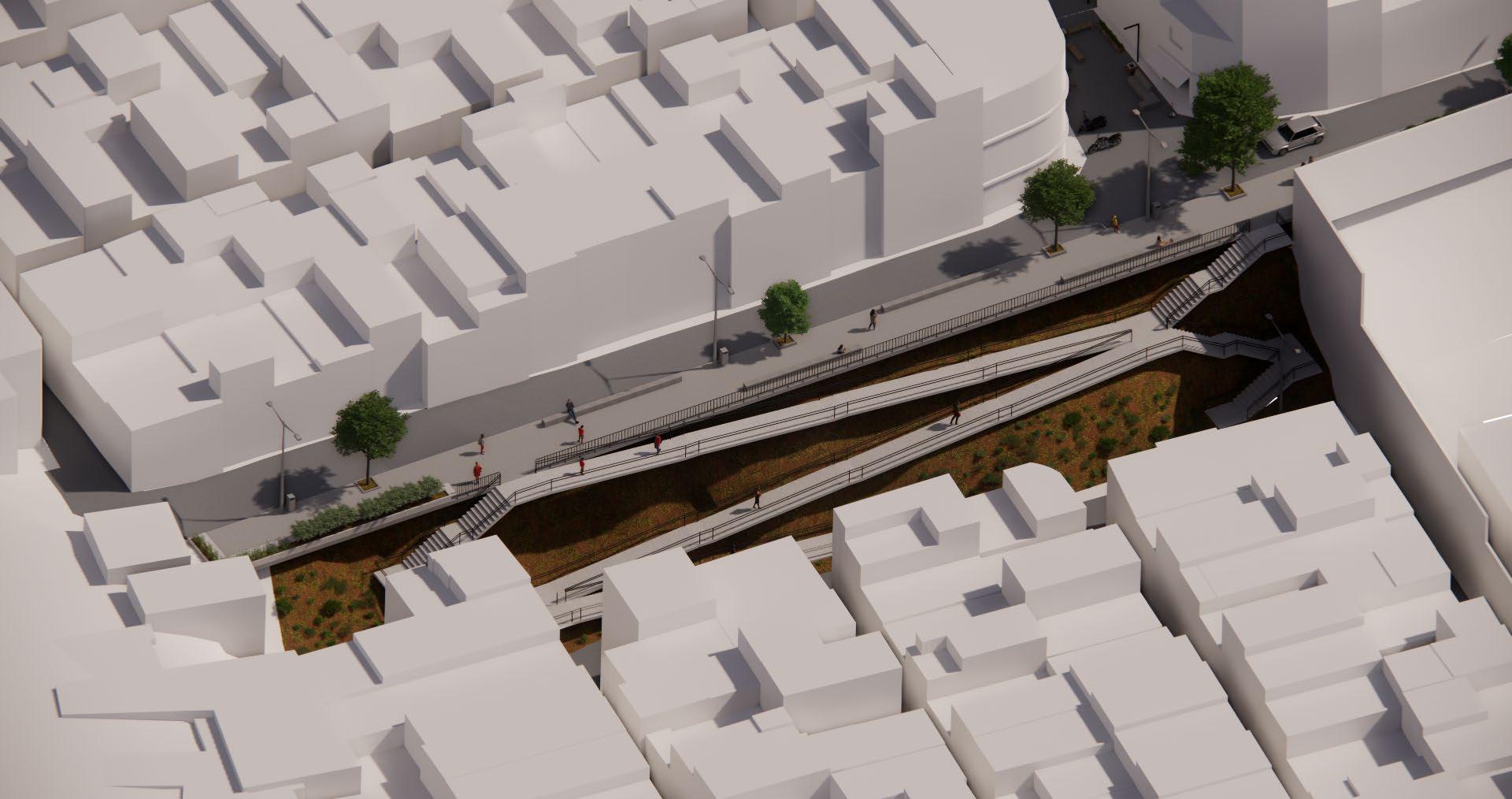 Escadaria integrada com rampa para possibilitar o deslocamento dos moradores ao longo da grande declividade. Neste e em outros pontos da comunidade os moradores são obrigados a se deslocar muitas vezes o dobro da distância para atravessar de uma rua para outra. Ao longo do tempo, moradores construíram diversas escadarias para contornar esse problema, porém quase todas estão em situação precária com alto risco de acidentes, pois não possuem nenhum tipo de acessibilidade