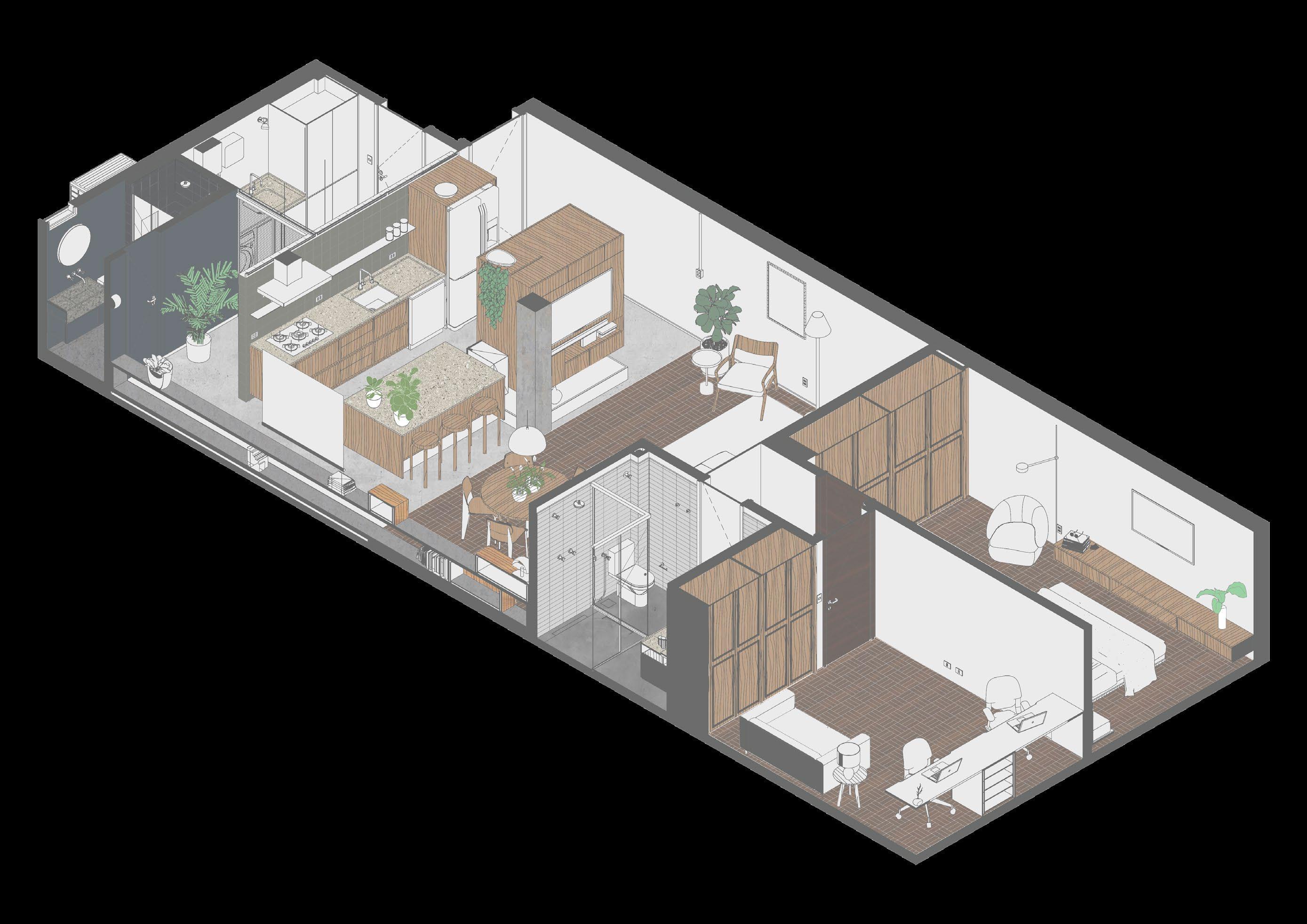 Trabalho final de graduação (TFG) intitulado “Vida Longa: um ensaio sobre habitação de interesse social para idosos na cidade de Osasco”. Dada a preocupação a respeito do aumento de expectativa de vida da população mundial e a carência de políticas públicas de inclusão da população da terceira idade, com esse projeto buscou-se ensaiar como seria uma habitação de interesse social voltada para o público idoso na cidade de Osasco. Usando como base boa parte das diretrizes existentes no Programa Vida Longa da CDHU, que dedica moradia de forma gratuita para idosos em situação de vulnerabilidade social, que, apesar de ser muito assertivo dentro de suas limitações, se concentra apenas no interior do estado, principalmente por questões monetárias. Além disso, através de pesquisas, observou-se a falta do contato intergeracional entre os moradores do programa, uma vez que os conjuntos habitacionais são exclusivamente para o público da terceira idade e são fechados por muros que isolam os idosos do restante da cidade. Com isso em mente, foi proposto um conjunto habitacional dedicado para a população idosa de baixa renda, mas que não fosse exclusivo apenas para esse público, favorecendo a interação entre os moradores de diferentes faixas etárias e que também abrigasse uma leva de programas que lúdicos e recreativos que funcionassem como uma forma de favorecer esse vínculo entre os moradores.