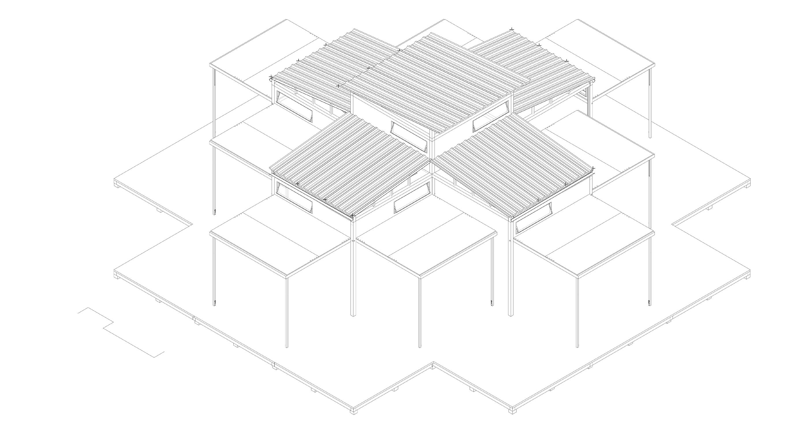 Estrutura: O abrigo contará com uma gaiola estrutural, composta por vigas e pilares metálicos com perfis tubulares formados a frio e encaixes de madeira que farão a ligação dessas arestas.