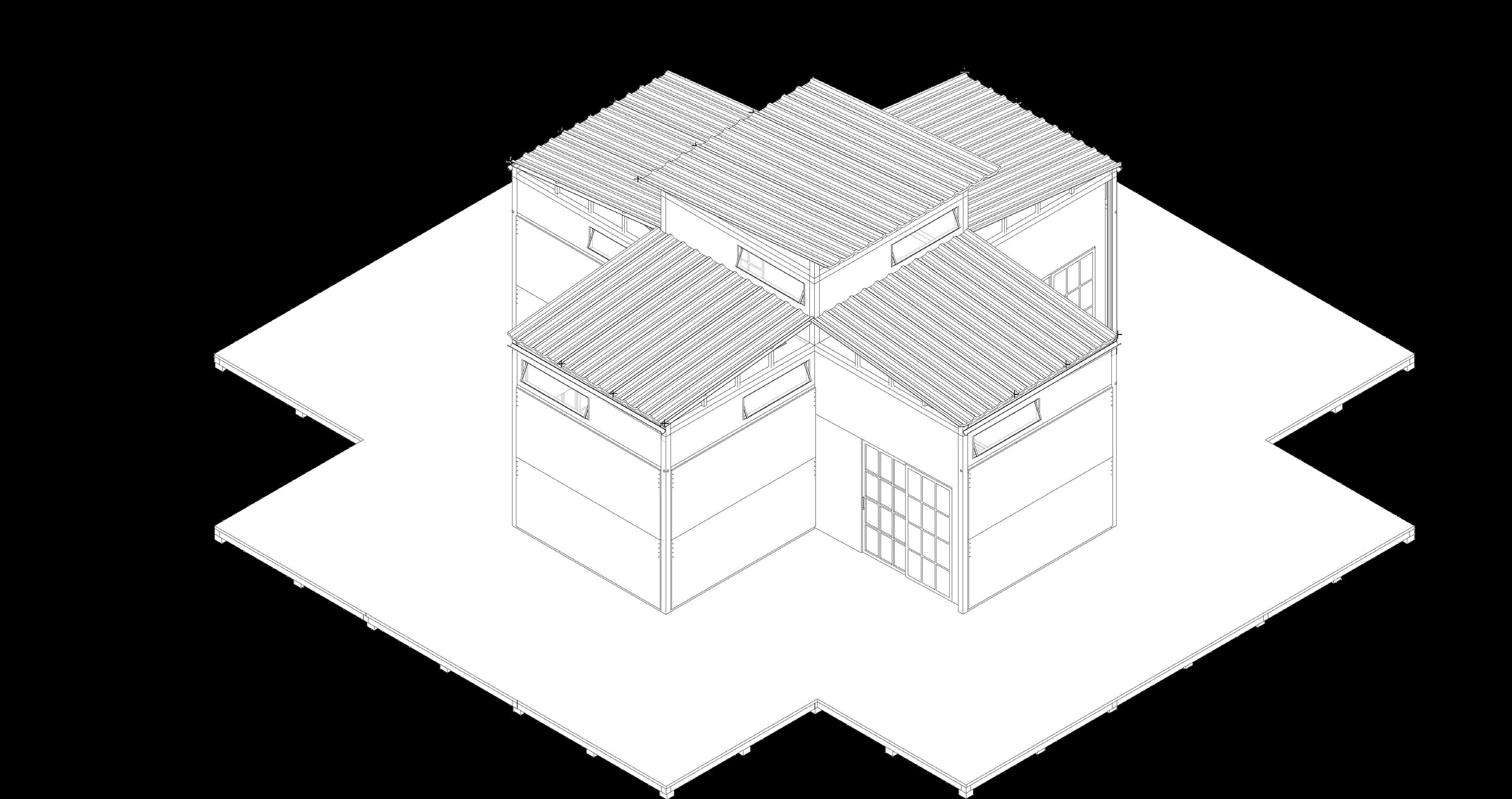 Telhado: A cobertura será composta por quatro camadas: um forro, uma grelha, uma camada de isolamento e a cobertura. O forro será feito com o mesmo material das paredes - madeira laminada colada (MLC) - em função de sua leveza e de sua fácil instalação e, nele, será instalado um trilho metálico que auxiliará na rotação de uma das paredes laterais do módulo.