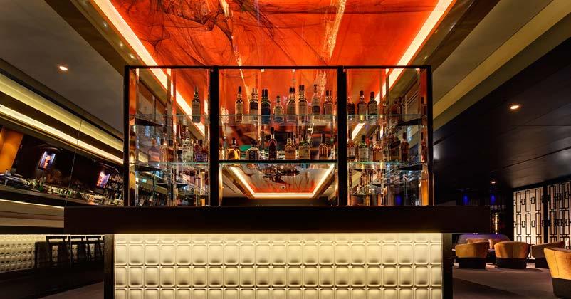 From the spectacular illuminated display feature behind the bar, the mirrored columns and perforated panels, through to the dramatic use vertical fish tanks. The unique carpet, inspired by the way light hits water, anchors the design, while the custom furniture softens the surfaces, creating an inviting and stylish space to experience the excitement of The Star.