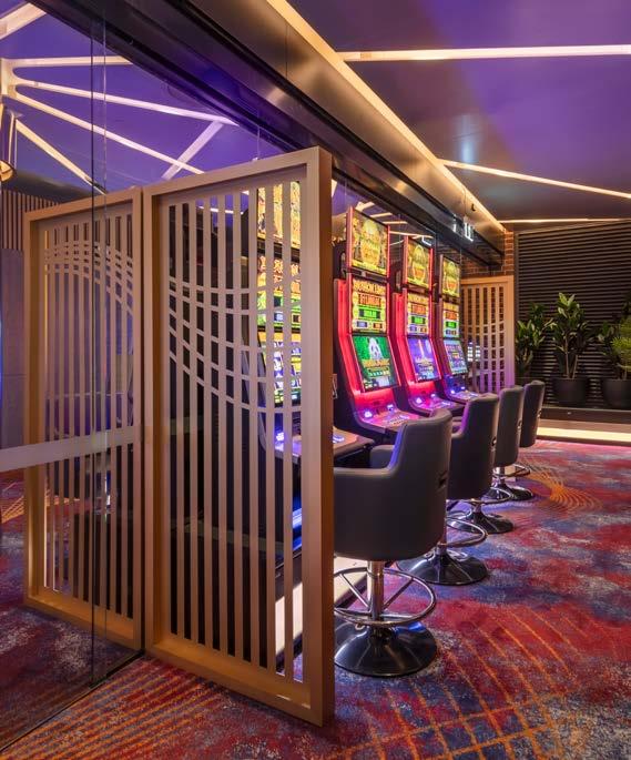 The Gaming Room has a dominant ceiling design that maximizes the available ceiling height. The ceiling design provides the perfect balance between form and colour with the perception and size of the room available for patron comfort and safety. The selection of materials and geometry match perfectly with the gaming layout and machine selection, whilst providing a timeless response to gaming design.