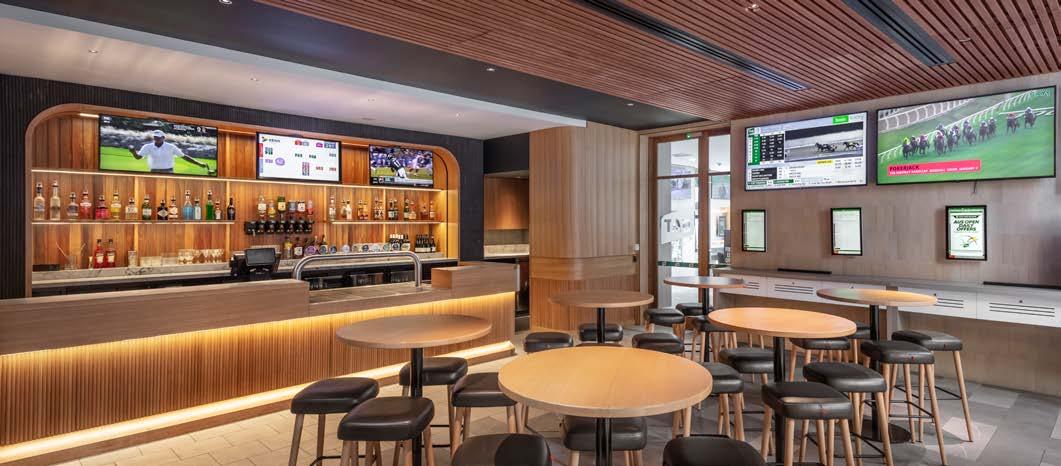 The design features custom joinery and trademark feature ceiling detail, and makes a feature of open space and a dramatic lighting installation. A striking golden bar completes the transformation of the space into a stylish gaming destination.