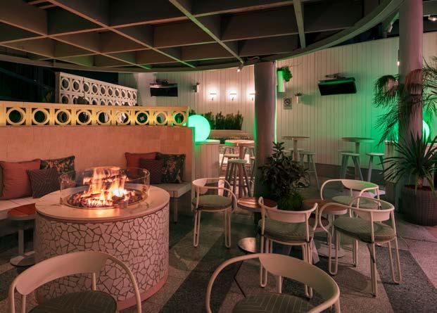 Fleets fun yet sophisticated fit out, with design touches from the 1980s, is complete with amber and dusty pink tones, custom made furniture and a long bar where rum reigns supreme. A wraparound outdoor terrace is decked out with green and white striped upholstery to add a garden party frisson, while the retractable roof and glass paneling not only caters to all weather conditions, but frames stunning city views to perfection.