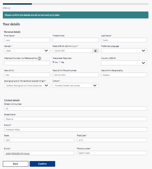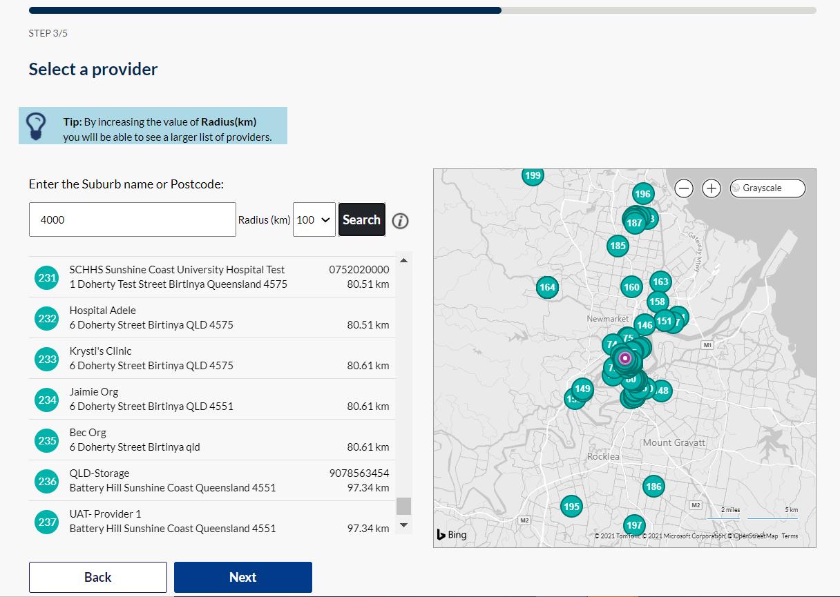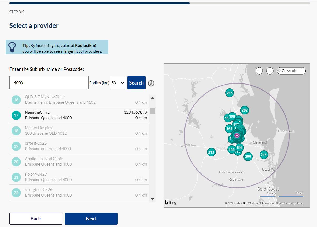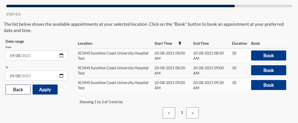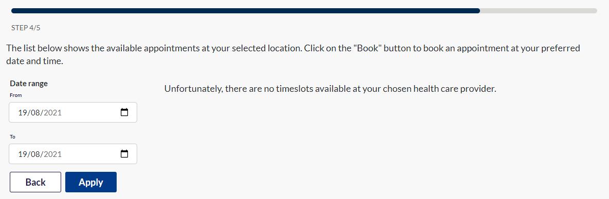 Note: If there are no times available at your chosen vaccine location, you can click Back and find a new location.