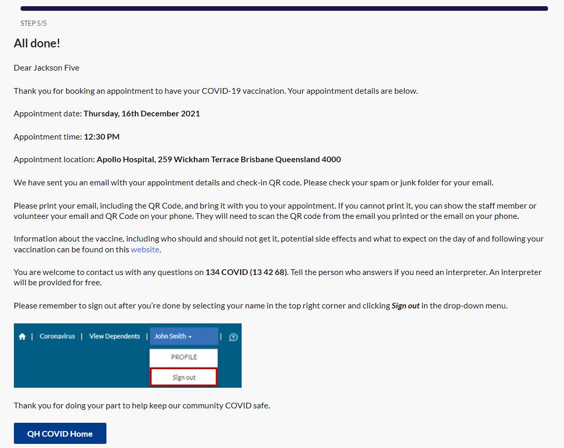 When you receive your first dose, a second dose appointment will be made for you This booking will be sent to your email. If the booking date or time does not work for you, please change your booking by following this guide Change or cancel a COVID 19 vaccine appointment for yourself or on behalf of someone else.
