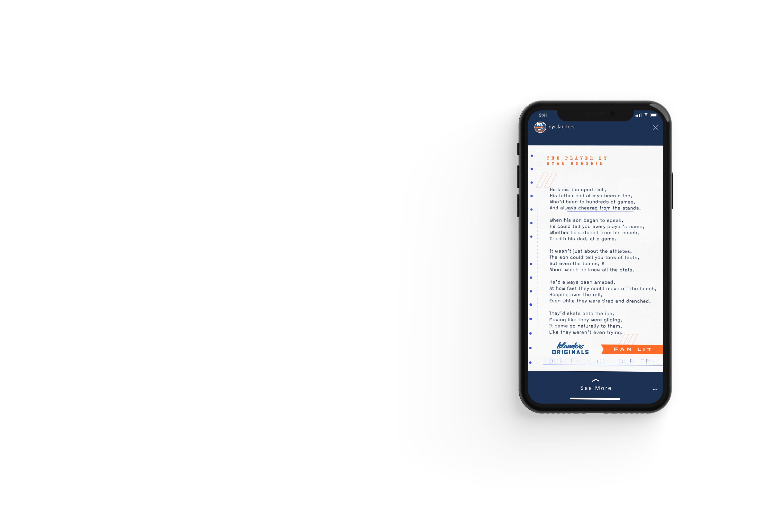 To showcase fan art we created the “ Islanders Originals ” evergreen campaign allowing fans to share their original art, photos, creative writing, and illustrations. This art would appear in both social and a landing page for fans to submit their art.