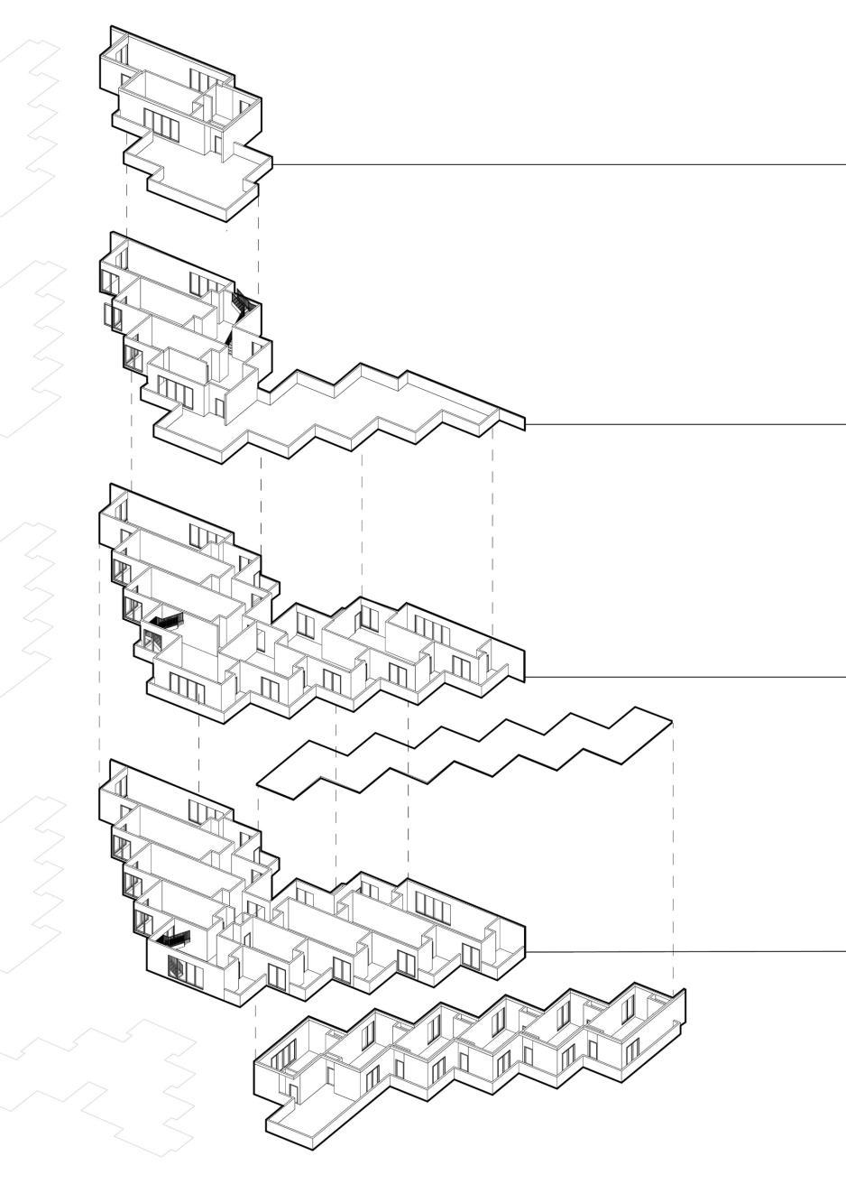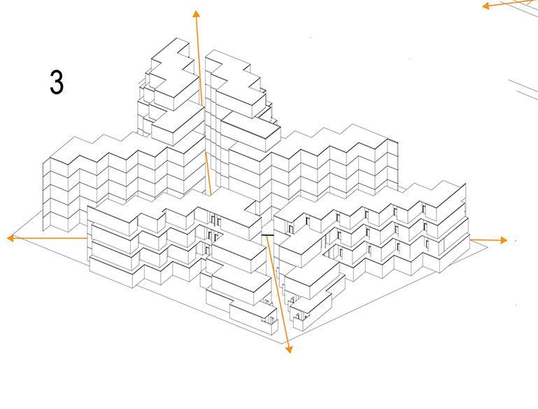 • En nuestro referente podemos encontrar que la edificación presenta una construcción basado en los pixeles como volúmenes separados brindando diversas formas en los volúmenes de cada departamento.