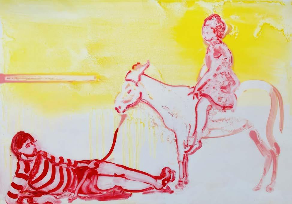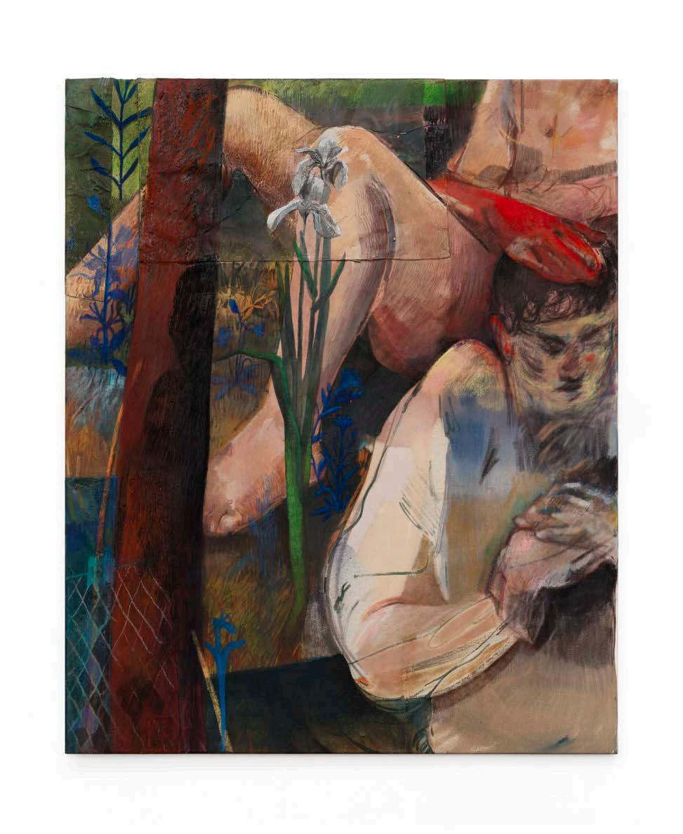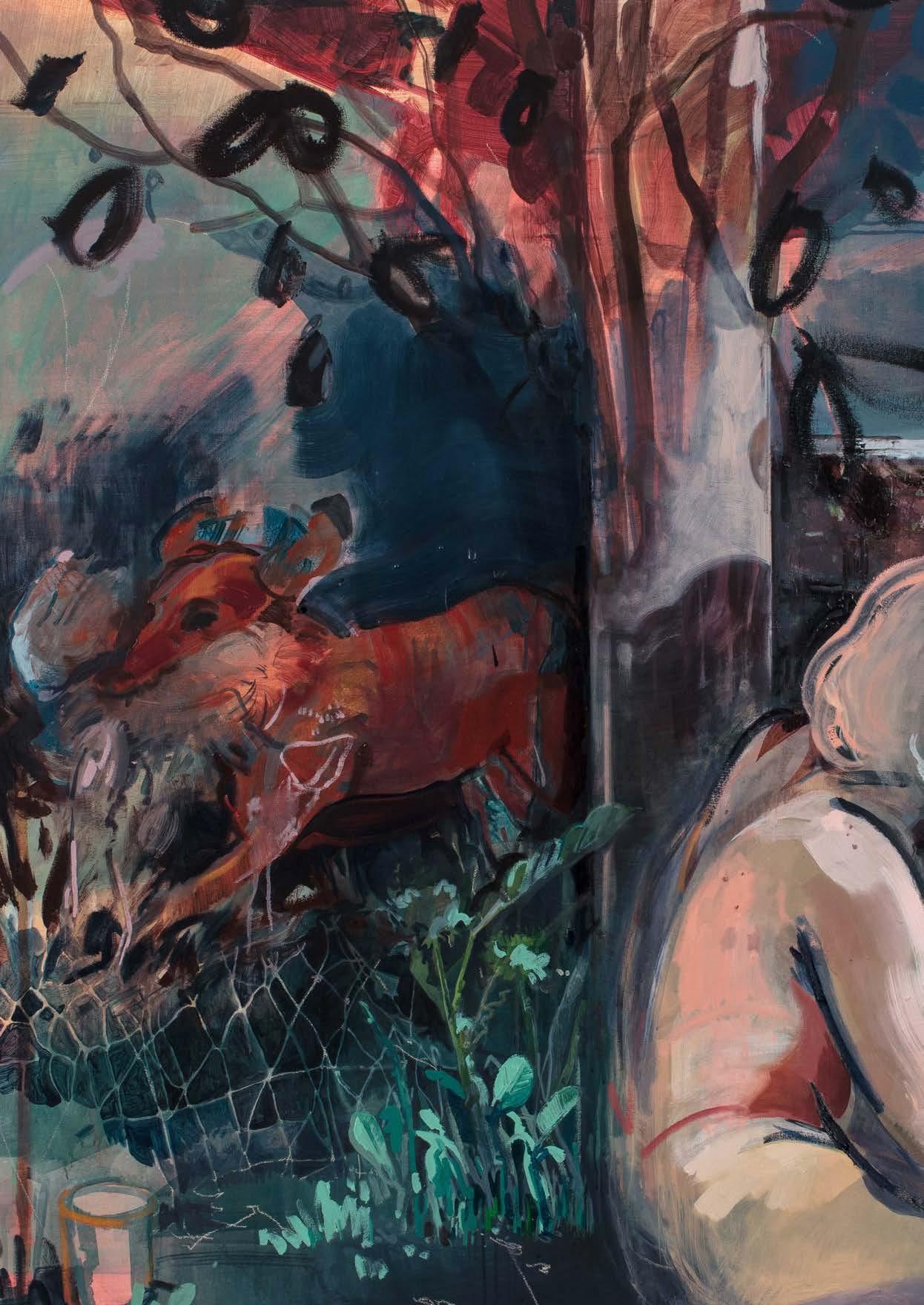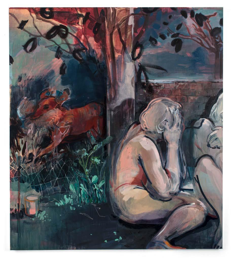 The contrast between the subject she paints and how it is painted is never sharp or demanding; the heavy, looping strokes and soft lines made by her brush point towards something much more ingenious and intuitive. These are contrasts that are gestured at, never insisted upon, and allow for a kind of dialectic with the viewer: a set of techniques more native to the literary arts than to the visual medium in which she works.