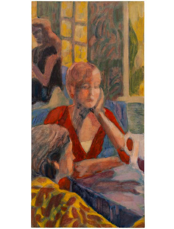 Papineau is interested in the malleability of memory and ambiguity of human relationships. Her practice begins in observations of everyday life. Drawing in public spaces, she observes people going about their lives and the interactions that take place between them. She takes these drawings back to the studio, allowing the images to gestate in her mind, taking on new meanings and merging with her own history. She paints from pencil drawings and written notes, allowing her inner life to influence her colour choices. Colour is used as a vehicle to express experience beyond the visual - her paintings contain sounds, scents, emotions and memories.