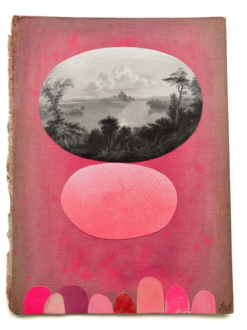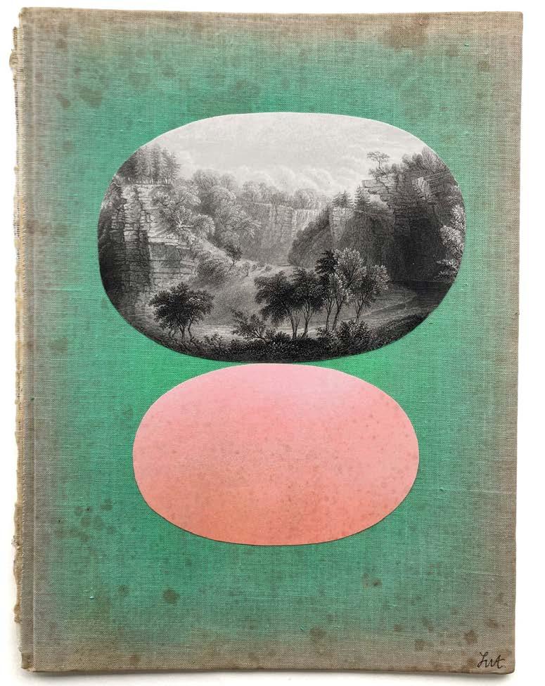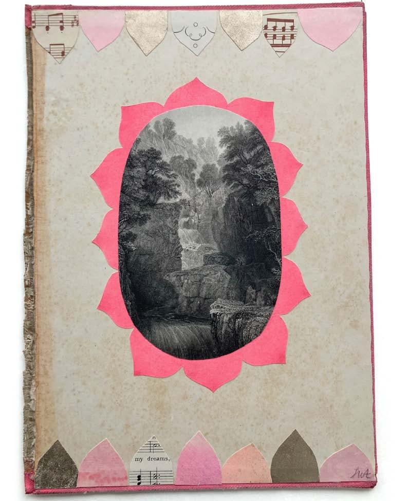 Antique engraving & mixed medium collage on vintage book cover 30 x 23 cm