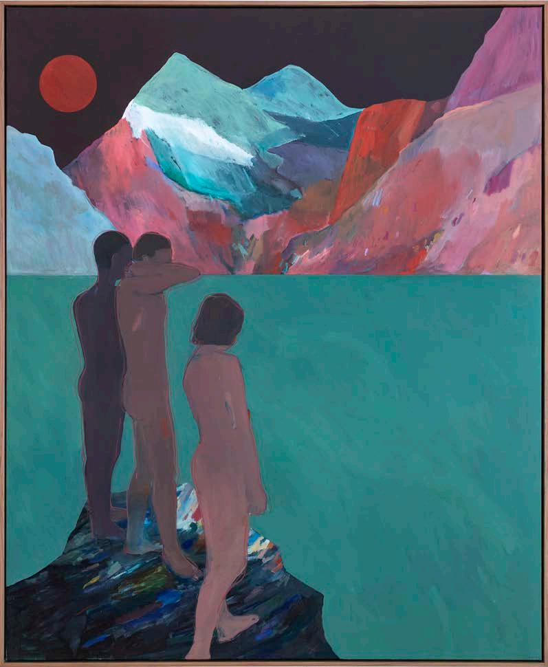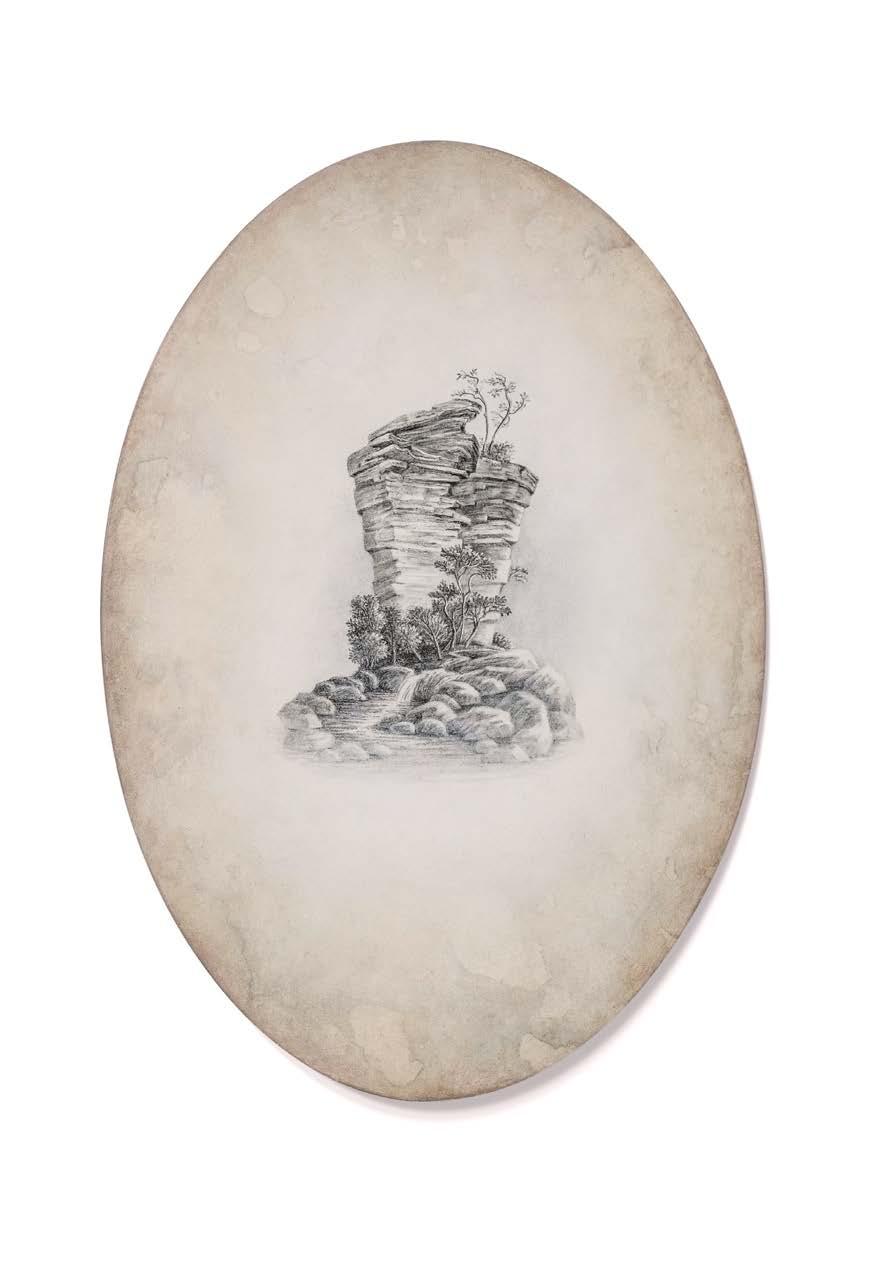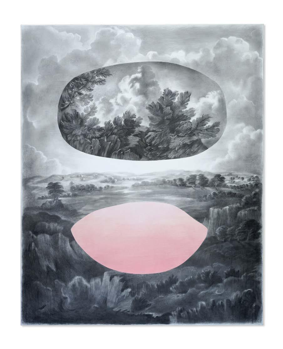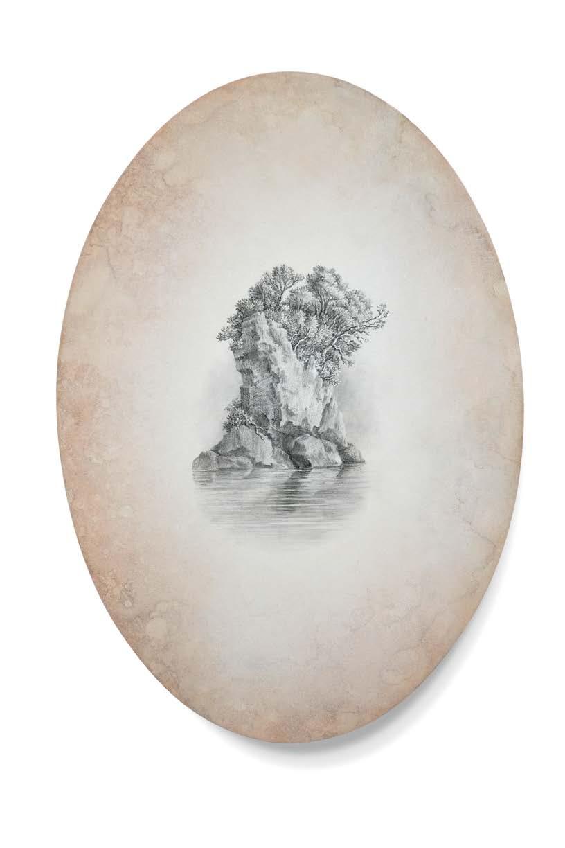 In nature she feels her mind is more enticed into a state of reverie out of the analytical brain shifting to a more divergent focus. She is interested to explore these shifts in perspective and ways of being in her paintings. The tension between the figuration of the illusory landscape forms and the tactile more painterly background alludes to our unique human ability to hold contrasting mental states in the same psychological space, the relationship between the mind and the body and the possibility of transcendence.