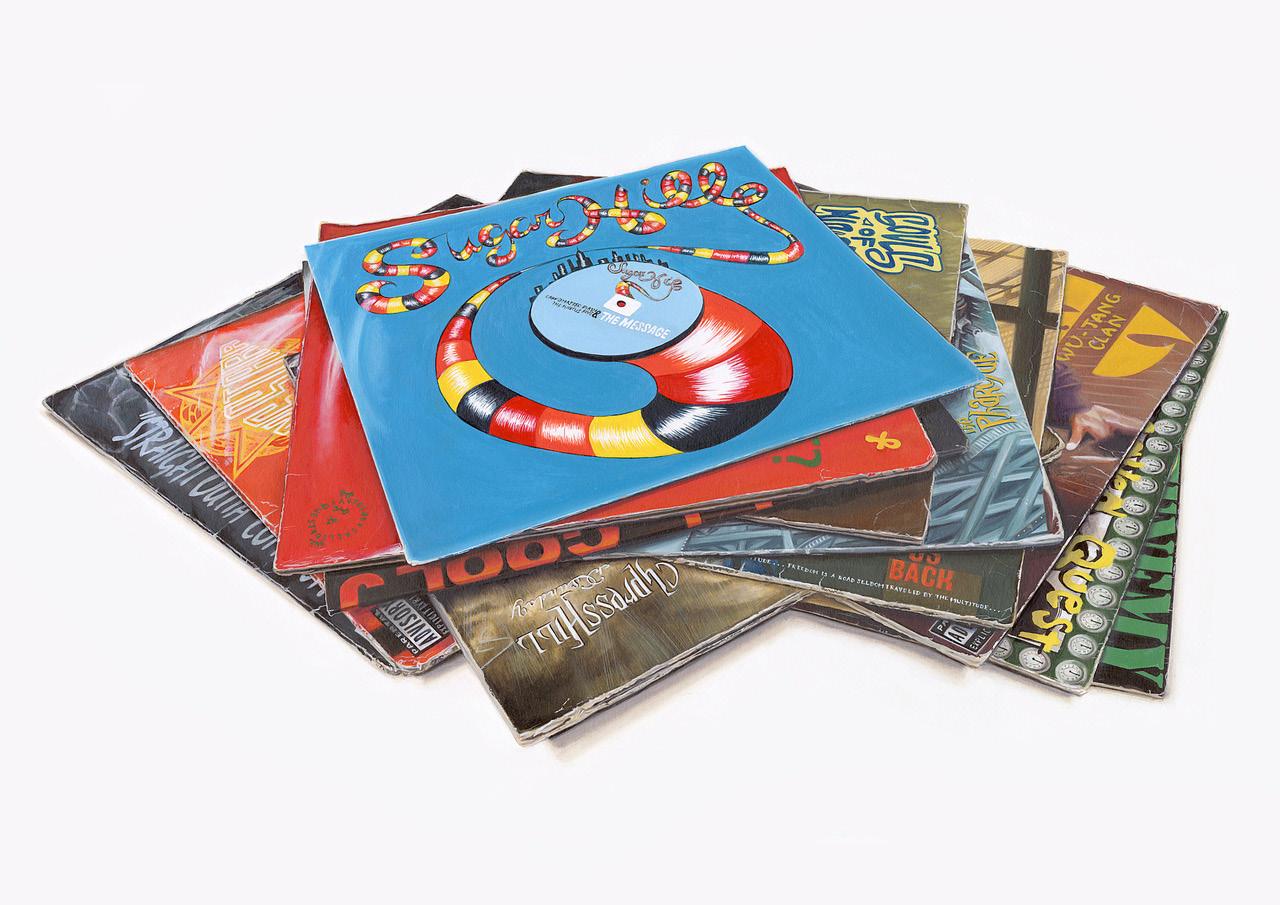 Creating paintings of UK pop culture, all lovingly rendered and curated, working with themes connecting to the vinyl enthusiast and book collector. And revelling in the collected material found in private collections and at Museum and library study rooms or close-to-home book shelves.