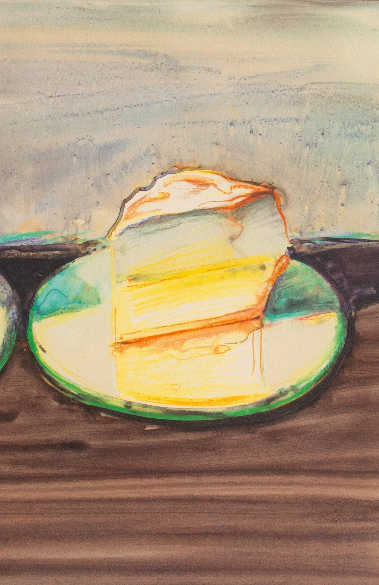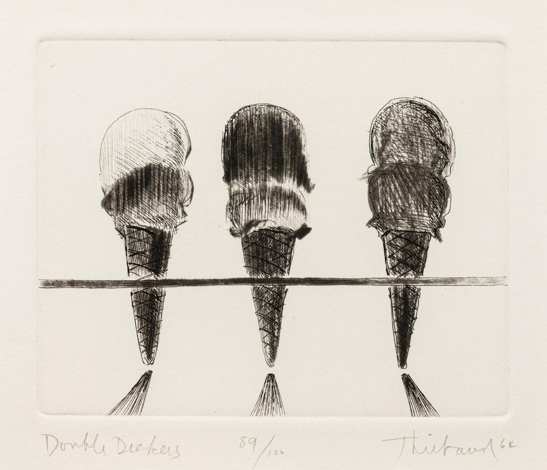 Internationally celebrated for his paintings, drawings, and prints of cakes, candies, people, cityscapes, riverscapes, and clowns, Wayne Thiebaud (1920-2021) was a prolific artist whose works have been collected across the globe. Beginning in 1960-1961, Thiebaud began painting cakes and pies in his mature style, with its tilted foreshortening of pictorial space and bright color palette. The following year, he had his landmark solo exhibition at Allan Stone Gallery in New York, with the result that his work was grouped with the other Pop artists of the period, even though he never considered himself to be one. With the success of the show, Thiebaud’s career took off and continued to soar until his death in 2021. Not long after this initial success, Thiebaud partnered with printmaker Kathan Brown (future founder of Crown Point Press) to create a series of 17 etchings called the Delights. Printed in 1964, among the subjects Thiebaud rendered are Double Deckers and Cake Window.