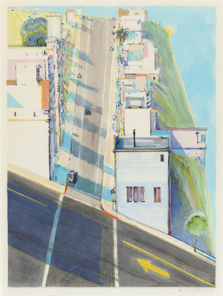 A closely related work from 1965 is Glassed Candy. Each of these works highlight Thiebaud’s superb draftsmanship and mastery of the etching process. Two works of similar subject matter from 1971 – Black and White Suckers and Little Red Suckers – reveal Thiebaud’s continued investigation of vernacular subject matter to see how it responded to nuanced aesthetic choices. Thiebaud also explored other methods of printmaking including lithography and monotypes. Two Meringues from 2004 is a signature example of Thiebaud’s mastery of lithography. Of special note among his lithographs is Paint Cans from 1990. Among the largest prints Thiebaud ever made, Paint Cans was commissioned to celebrate the tenth anniversary of the Chicago International Art Exposition in 1990. Among his monotypes, Ripley Ridge is a unique cityscape masterpiece. After completing the initial printing of Ripley Ridge, Thiebaud went back into the work and added layers of watercolor by hand onto a significant portion of the print.