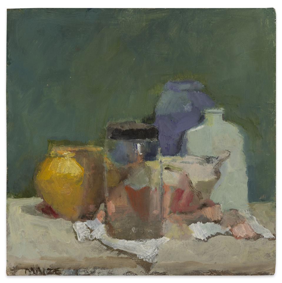 Celebrated as one of the most influential and generationally defining frame designers of the 20th century, Robert M. Kulicke (1924-2007) was also a highly accomplished painter of still life’s – “The Morandi of Manhattan.” The son and brother of design engineers, Kulicke studied art in high school and advertising design at the Philadelphia College of Art. After WWII, he went to Paris and studied in the atelier of Fernand Léger but was turned off by the artist’s emphasis on large-scale, bold compositions. During his stay, he also apprenticed to several framers. It wasn’t until 1957, after his return to New York and establishment of his own frame shop, that Kulicke was inspired to return to painting. The precipitant event was the delivery of 300 paintings by Giorgio Morandi from the World House art gallery. Seeing these works, Kulicke got the confidence to work at small scale.
