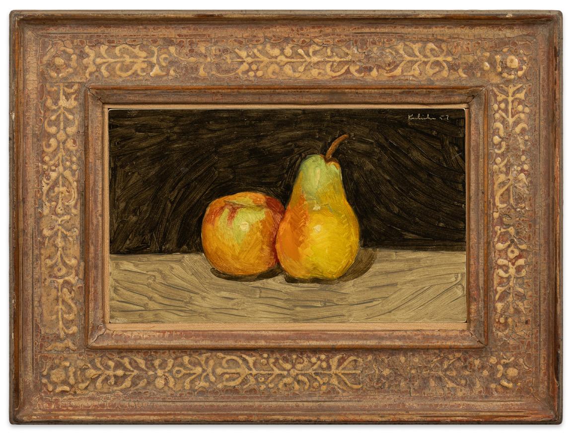 The results are intimate views of flowers, fruits, and the occasional land or seascape. Pear and Apple Against a Black Background (1957) is a signature early work made not long after his encounter with Morandi. Painted in short strokes of thinned oils, Kulicke’s brushwork in the background creates a rhythm of movement highlighting the expressively rendered pear and apple subjects. Two Pears and a Lemon on a Brown Surface Against a Black Background (n.d.) exemplifies the stylistic evolution of Kulicke’s paint handling. Here, Kulicke’s paint strokes merge into definable shapes and forms, while still maintaining their presence. The background, now a solid form, highlights the play of light and shadow across the table, pears and lemon. The same can be said about Pear on a Brown Surface Against a Black Background, from 1964. All three paintings have Kulicke’s signature carved frames with aged detailing. His skills as a framer and as a painter secured his position in the art world as an important artist to be remembered.