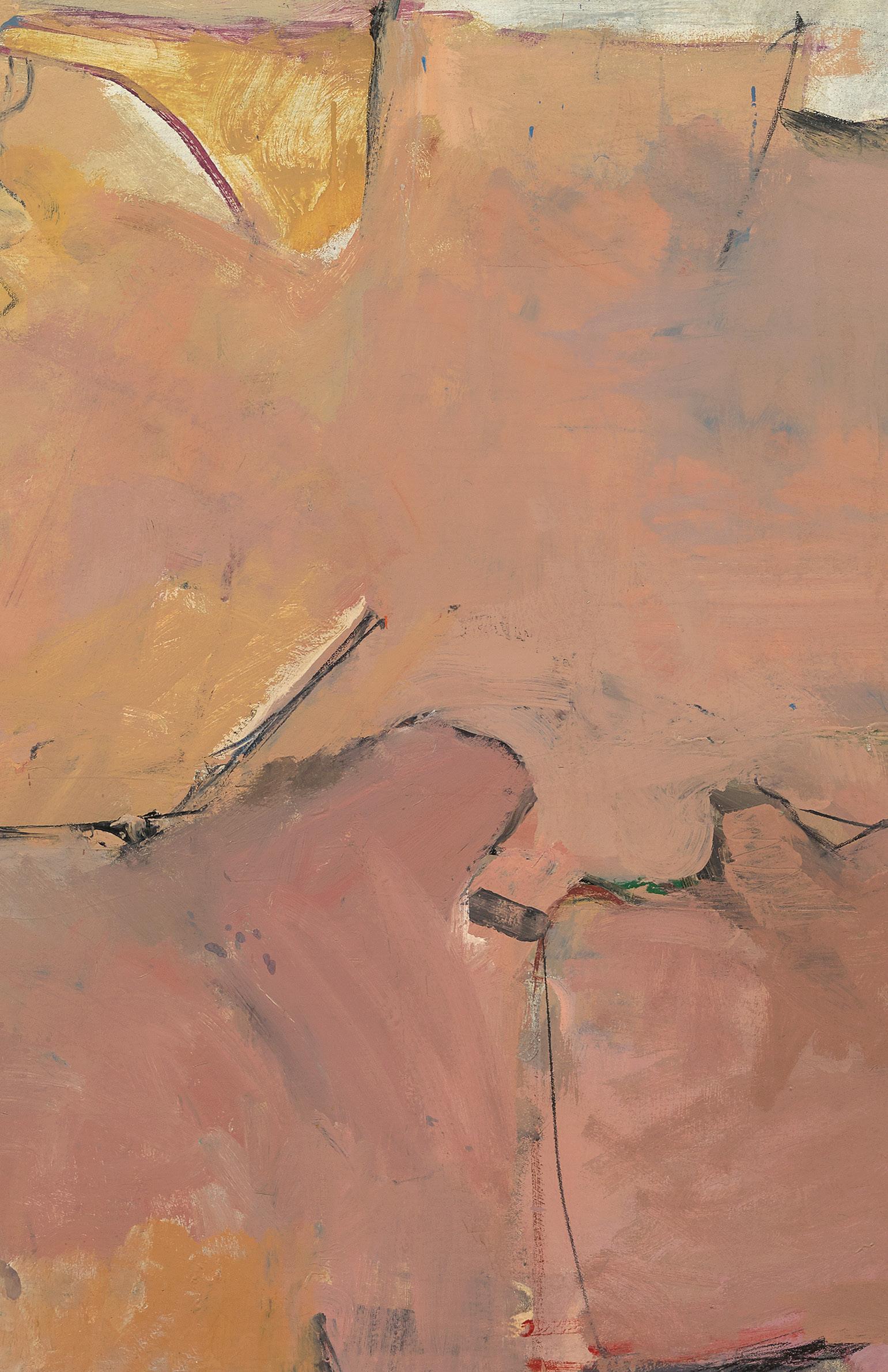 through abstraction as one both structurally and chromatically derived from landscape. The Albuquerque paintings display a muted range of desert tones – whites, greys, bleached pinks, and pale yellows – indicative of the rugged terrain of New Mexico. After a brief sojourn to teach at the University of Illinois, at Urbana, for the 1952-1953 academic year, Diebenkorn returned to Berkeley, where he would remain for well over a decade.