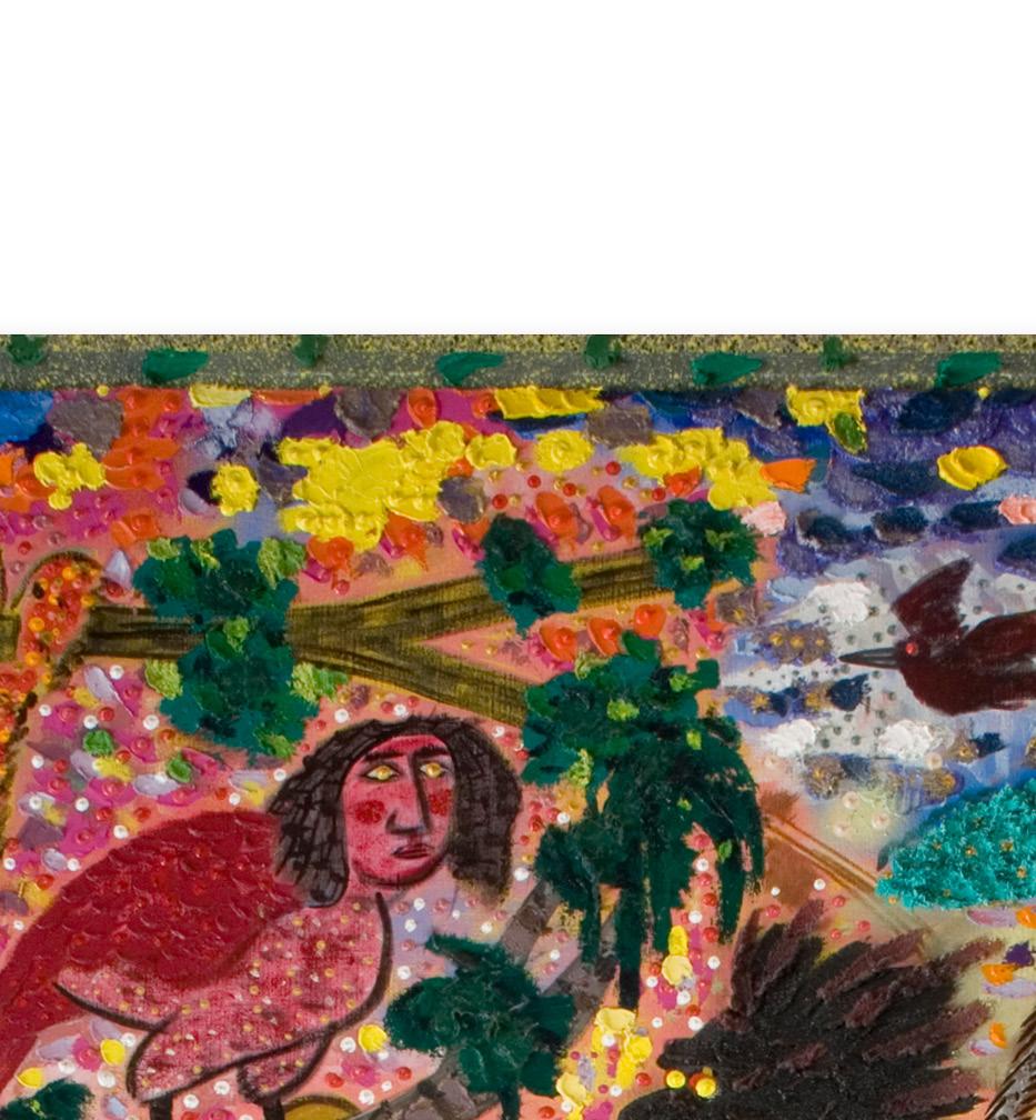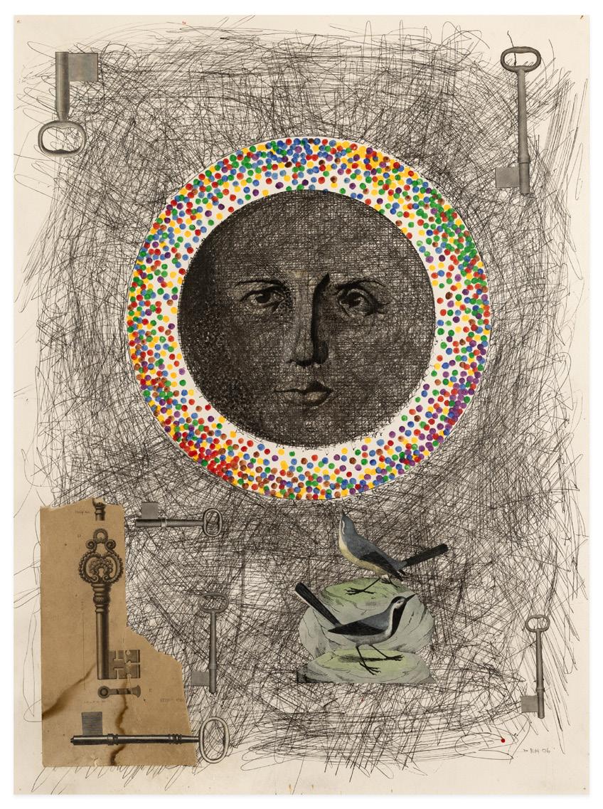 Alongside his assembled sculptures and ceramics, Hudson has been a prolific drawer throughout his career, apply the same ethos to collage and mark making as he did in sculpture. Untitled (Drawing), (2006), is a prime example of Hudson’s drawings from the last twenty years. The central moon shape with a face is surrounded by a halo painted in Hudson’s signature motif of layered multicolored dots of paint. Around these he has created a field of black lines onto which he has collaged found imagery, including a bird. Combining these elements together, Hudson achieves a deft synthesis of forms into a pictorial whole.