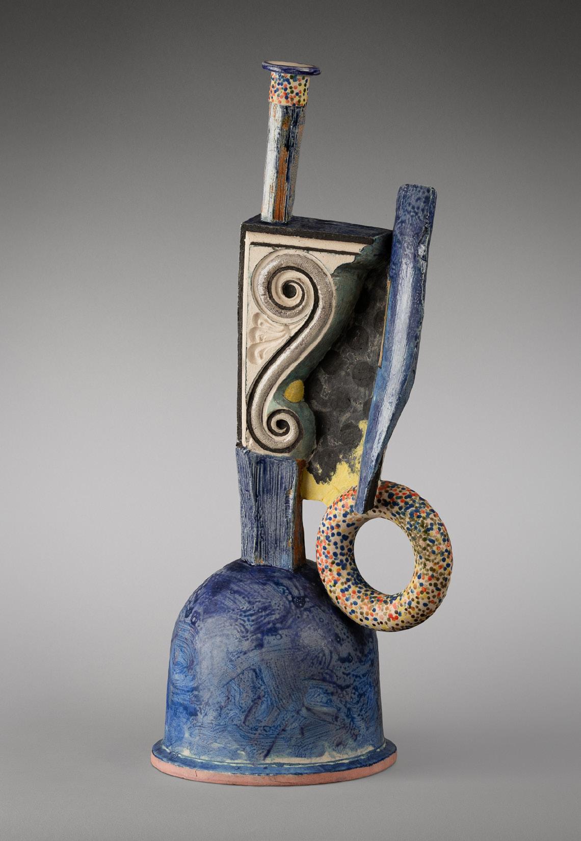 While this early intensive period of ceramic work only lasted until 1974, Hudson would return to the medium in the following decades find out what else it had to offer. Bottle with Weed, (2000) is from a period of work created thirty years after the first. While many years separate the first group of works from later pieces, Hudson’s arrangement of forms and choice of glazing is consistent in style, even as his oeuvre has evolved.