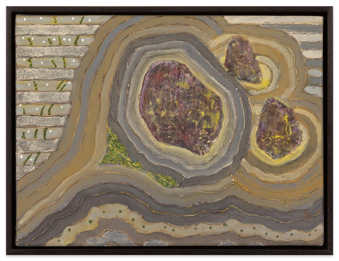 The compositions of Okamura’s Rock Study Series from approximately 2006-2009 each contain arrangements of three stones surrounded by fields of loose concentric lines that recall the raked patterns in Japanese sand gardens. Okamura’s building up of the paint into articulated ridgelines both conveys a sense of energy emanating from the stones, while also lending a surreal aspect to each work. While Okamura never revealed the possible meanings behind his paintings, rocks in Asian gardens can have various, and simultaneous, meanings – islands, mountains, a source of natural power, and/or the figure of Buddha itself, to name a few. While Okamura’s rock studies borrow their structure from Zen rock gardens, the compositions do not represent any specific real-life garden. In that way, they move into a timeless, eternal realm that allows for deep meditative contemplation.