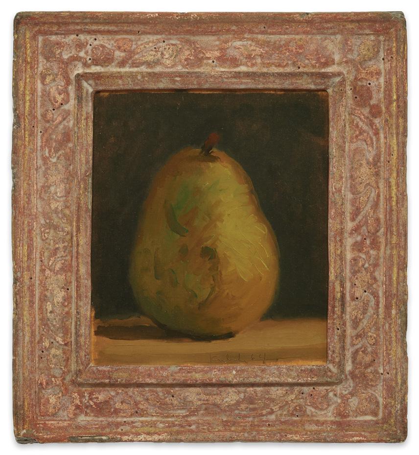 Robert M. Kulicke, Pear on Brown Surface Against a Black Background, 1964 oil on silk mounted on paper, frame: 11 1/16 x 9 13/16 inches