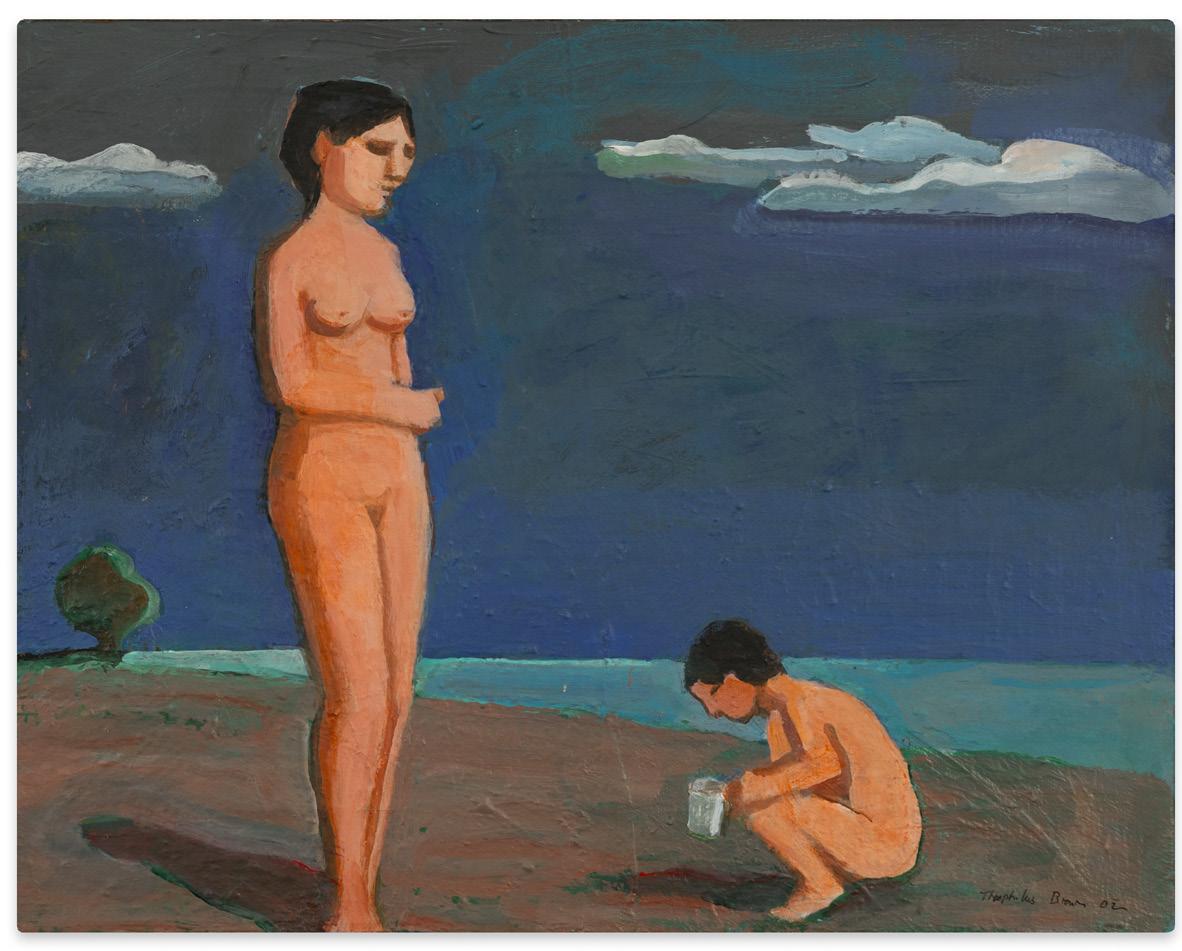 Jaime Seated (Green Background) (1997) and Two Artists with Model (2009) are iconic subjects from final decades of Brown’s output. Jaime Yates, a close friend to both Brown and Wonner, sat for Brown numerous times in the late 1990’s, after he was released from the U.S. Navy. From the 1950s onward, regardless of where they were living Brown and Wonner maintained an active life drawing group that their artist friends participated in, which over time included many well-known and famous painters, including Wayne Thiebaud and Richard Diebenkorn. Brown would often draw and paint scenes from these sessions, like Two Artists with Model, 2009, or scenes of himself painting a model in his own studio.