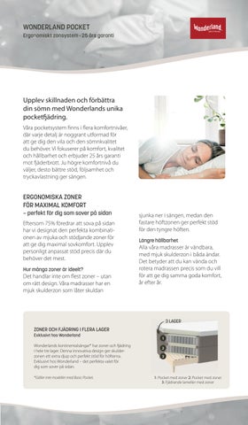 *Gäller inte modeller med Basic Pocket. Wonderlands kontinentalsängar* har zoner och ädring i hele tre lager. Denna innovativa design ger skulderzonen ett extra djup och perfekt stöd för höfterna. Exklusivt hos Wonderland – det perfekta valet för dig som sover på sidan.